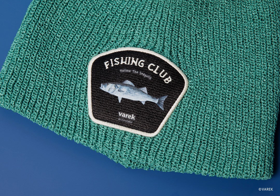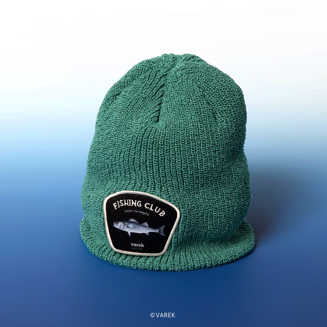 架空のフィッシングクラブがモチーフのワッペンをフロントに飾ったニットキャップ。シャリ感のある吸水速乾性に優れた和紙混紡の糸で編み上げることで、夏でも快適にかぶることができるニットキャップに仕上げています。ご家庭での手洗いも可能。