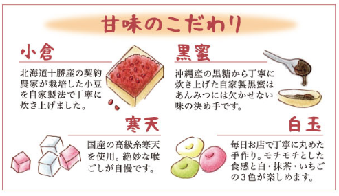 •寒天は京都から仕入れた高級糸寒天をお店で丁寧に煮溶かし固めました。絶妙なのどこしはお勧めです。