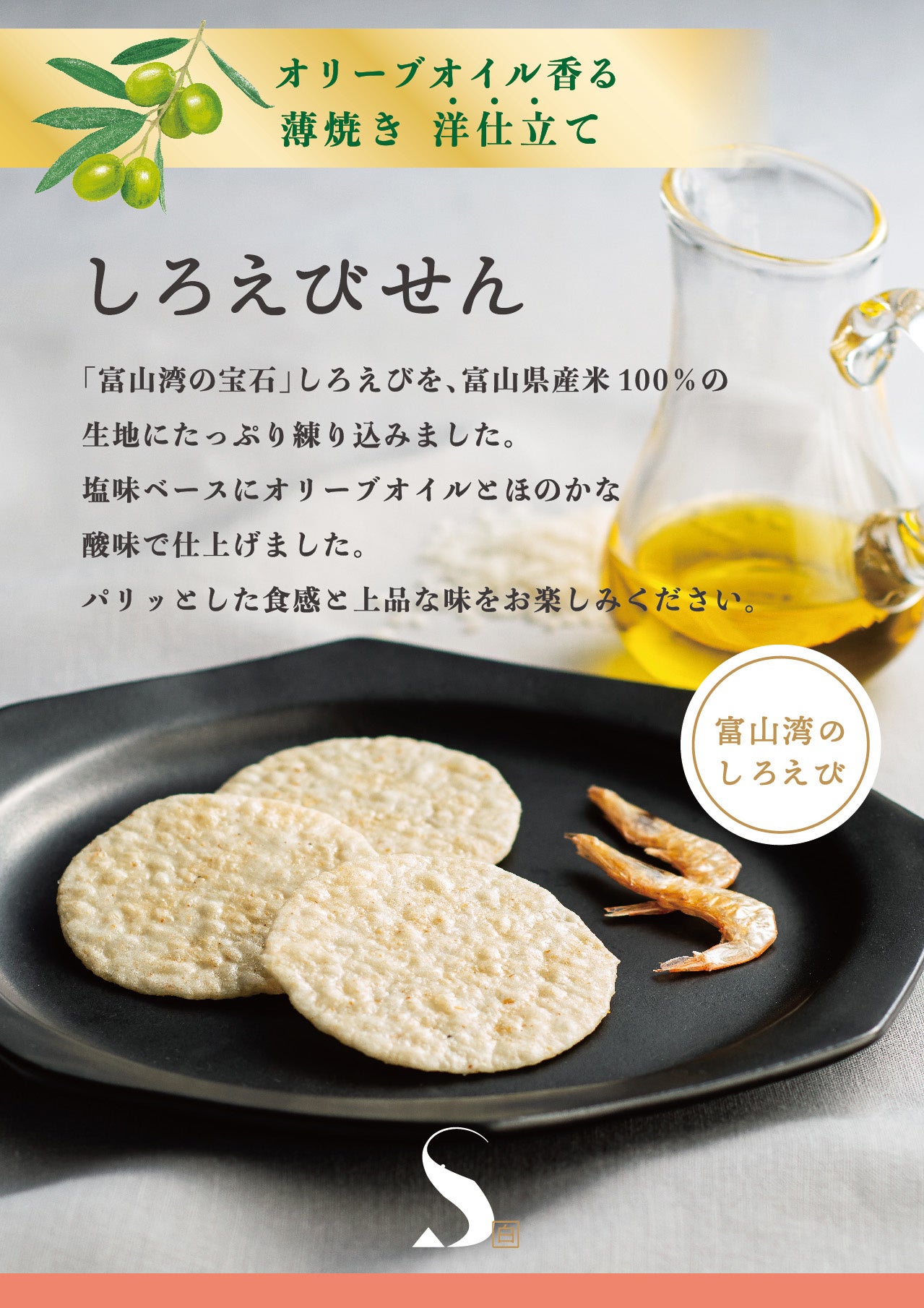 富山湾の宝石「しろえび」を、富山米100%の生地にたっぷりと練りこみました。パリッとした食感の塩味ベースのしろえびせんべいをオリーブオイルとほのかな酸味で上品な味に調えました。