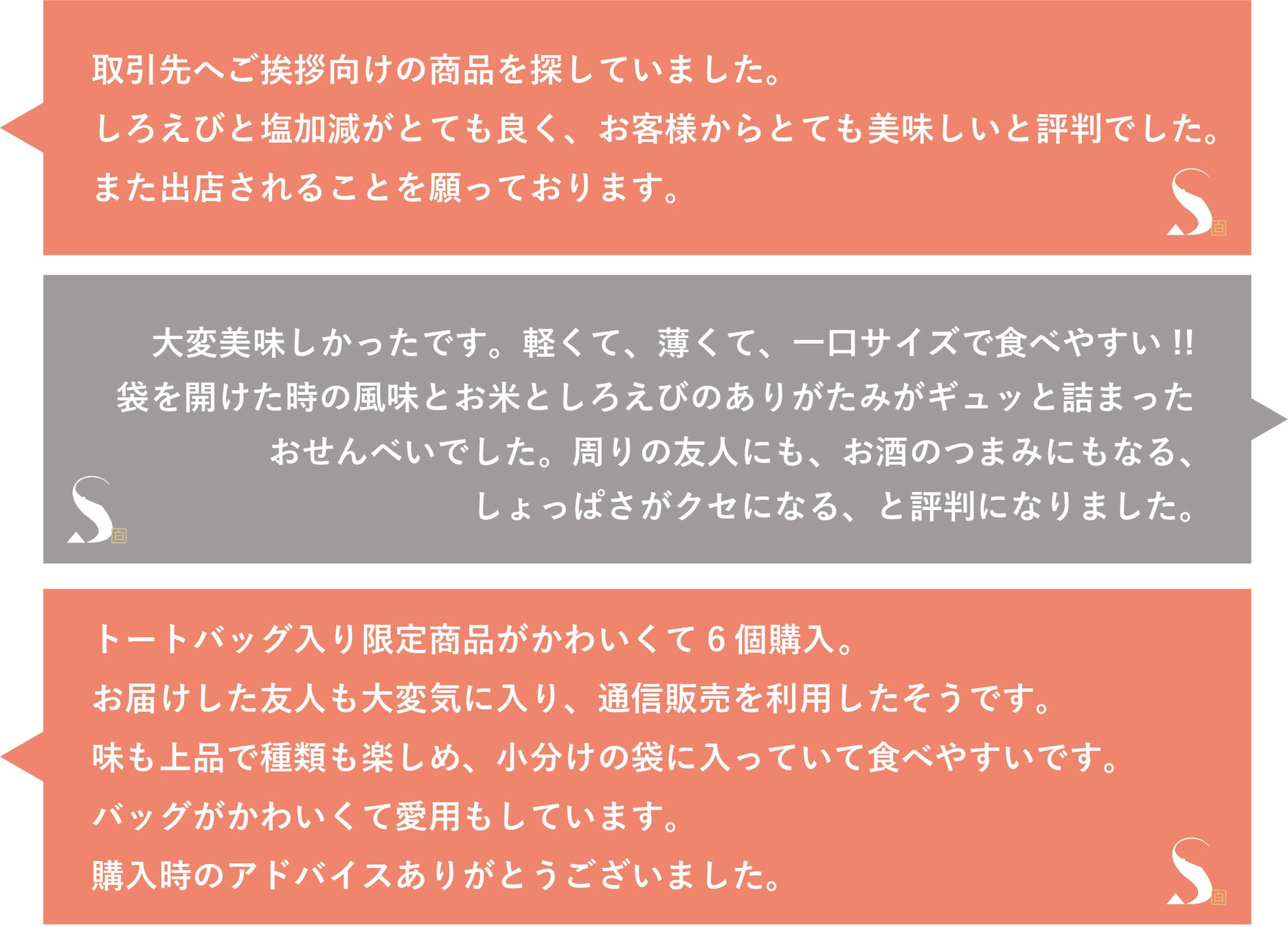 毎回行列ができる大人気ブランド、しろえび米菓専門【SHIRO SASARAYA】。富山湾の宝石「しろえび」を使用したオリーブオイル香る贅沢な味わいの『しろえびせん』、何枚でも食べられるおやつタイプのSHIRO TSUMAMI5種類、ブランドロゴがデザインされたトートバッグに人気商品を詰合せた数量限定商品、新商品贅沢かきもち米菓「しろえびもち」を販売いたします。老若男女問わず、ちょっとした手土産や贈り物、ご自宅で気軽なおやつにもおすすめです。