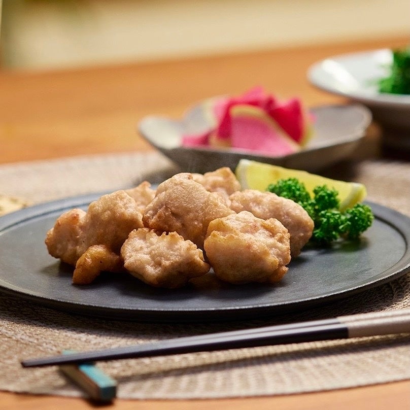 豆乳を搾る際の副産物「おから」と日本の伝統食である「こんにゃく」を組み合わせた『おからこんにゃく®』で作った動物性原材料不使用のからあげです。 おかずの一品としても満足頂けるよう、和風ベースで飽きの来ない、ジューシーな味わいに仕上げました。