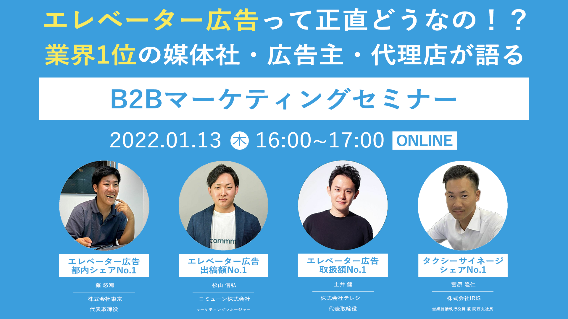 本ウェビナーは、都内シェアNo.1のエレベーターサイネージ「GRAND」を運営する株式会社東京(東京都新宿区、代表取締役:羅 悠鴻)、「GRAND」において2021年度年間出稿額1位のコミューン株式会社(東京都品川区、代表取締役CEO:高田 優哉)、BtoBマーケティングのトレンドであるタクシーサイネージの台数シェアNo.1である「Tokyo Prime」を運営する株式会社IRIS(本社:東京都港区、代表取締役:眞井 卓弥・宇木大介)、そして、「GRAND」における2021年度年間販売額1位を獲得した弊社テレシーが登壇し、BtoBマーケティングの最新トレンドであるエレベーター広告について、赤裸々にお話いたします。