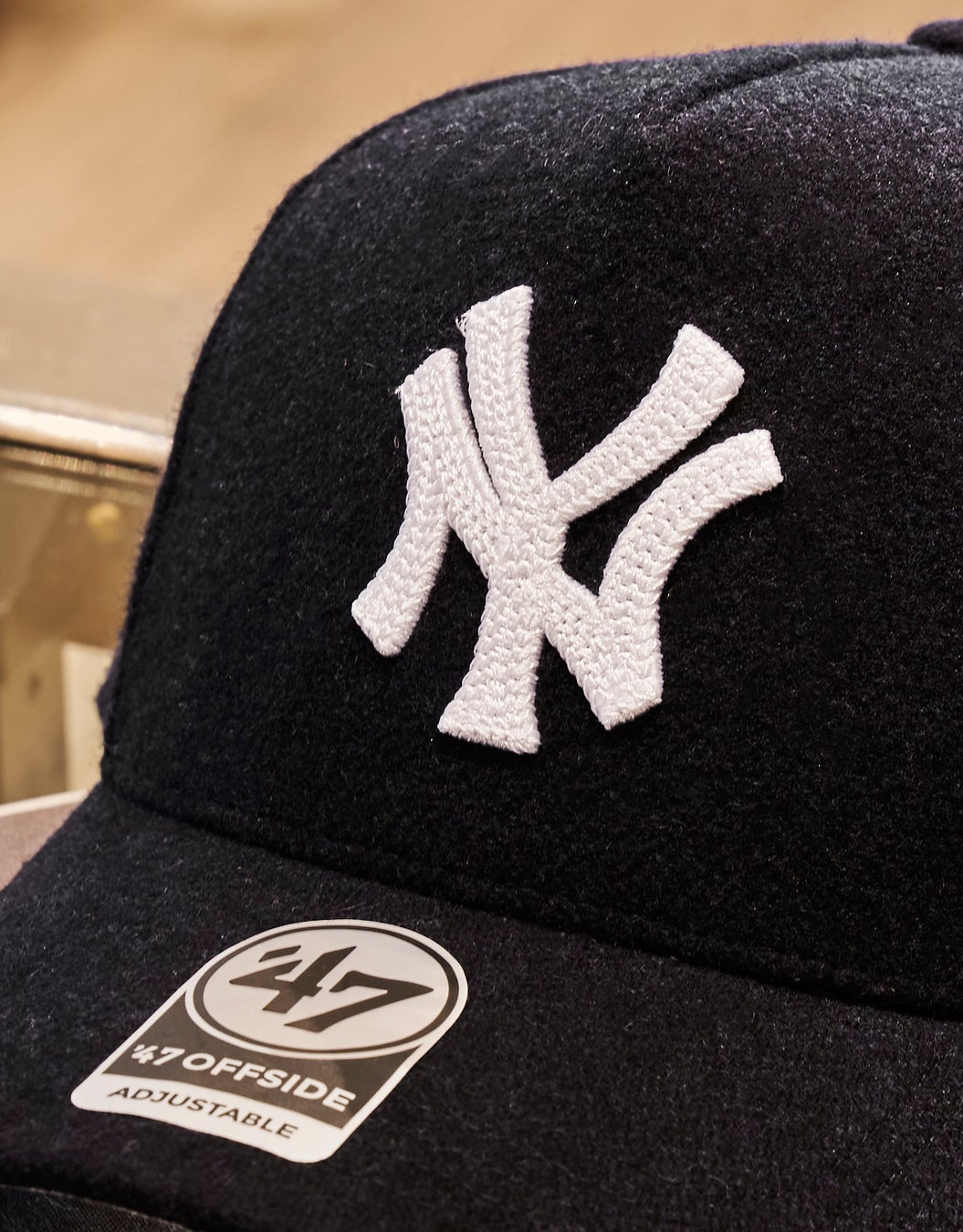 綺麗めのネイビーのウール地にホワイトのチェーンステッチロゴがマッチ。過去にユニフォームに使用されていたヤンキースのクラシカルなロゴをモチーフにし、オールドスタイルのボールキャップを演出しています。