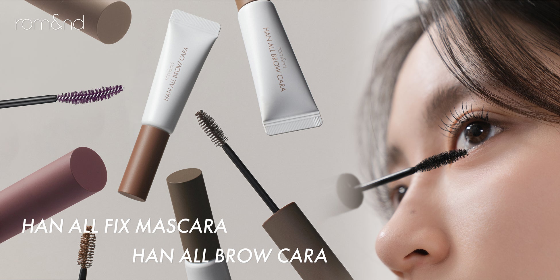 韓国コスメブランド「rom&nd(ロムアンド)」は、ブランド初の眉マスカラ「ハンオールブロウカラ」4色を、日本国内向け に7月27日(木)より販売開始します。また、口コミサイト等での受賞歴をもつ「ハンオールフィックスマスカラ」の新色2色も同時に発売します。