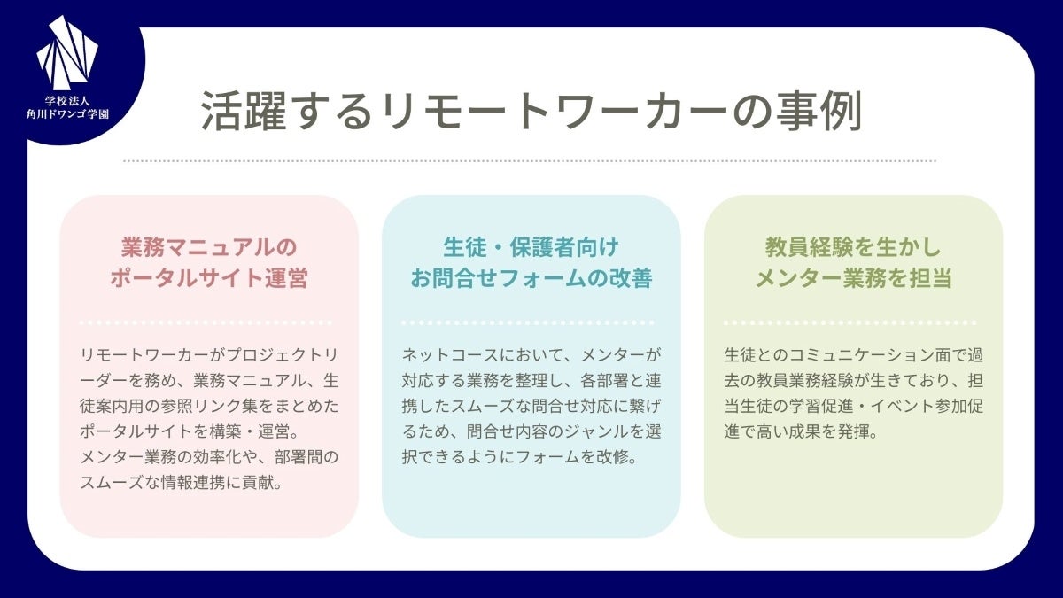 生徒数が3万名を超える当学園では、教務面に限らず、業務効率化や負担軽減が必要な場面が増えており、リモートワーカーが活躍する場も広がっています。有効的に時間を確保して当学園の「教員免許取得制度」を利用し、実際に教員免許を取得したリモートワーカーもいます。