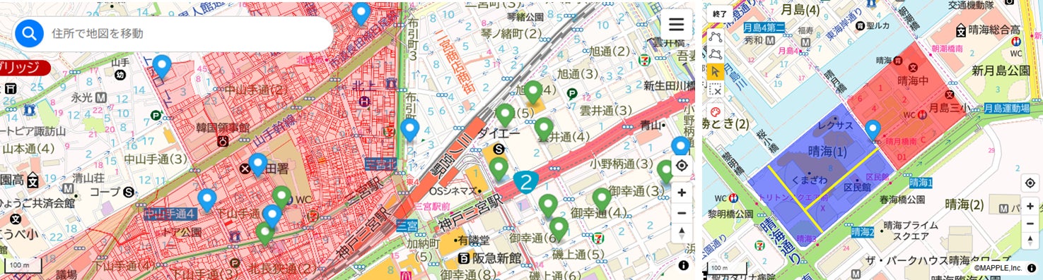 「MAPPLE地図プラグイン for kintone」は、サイボウズ株式会社が提供する「kintone」上で、マップルが持つ高精度な地図データを活用し、顧客管理や物件管理、現場管理などの業務を視覚化するサービスです。