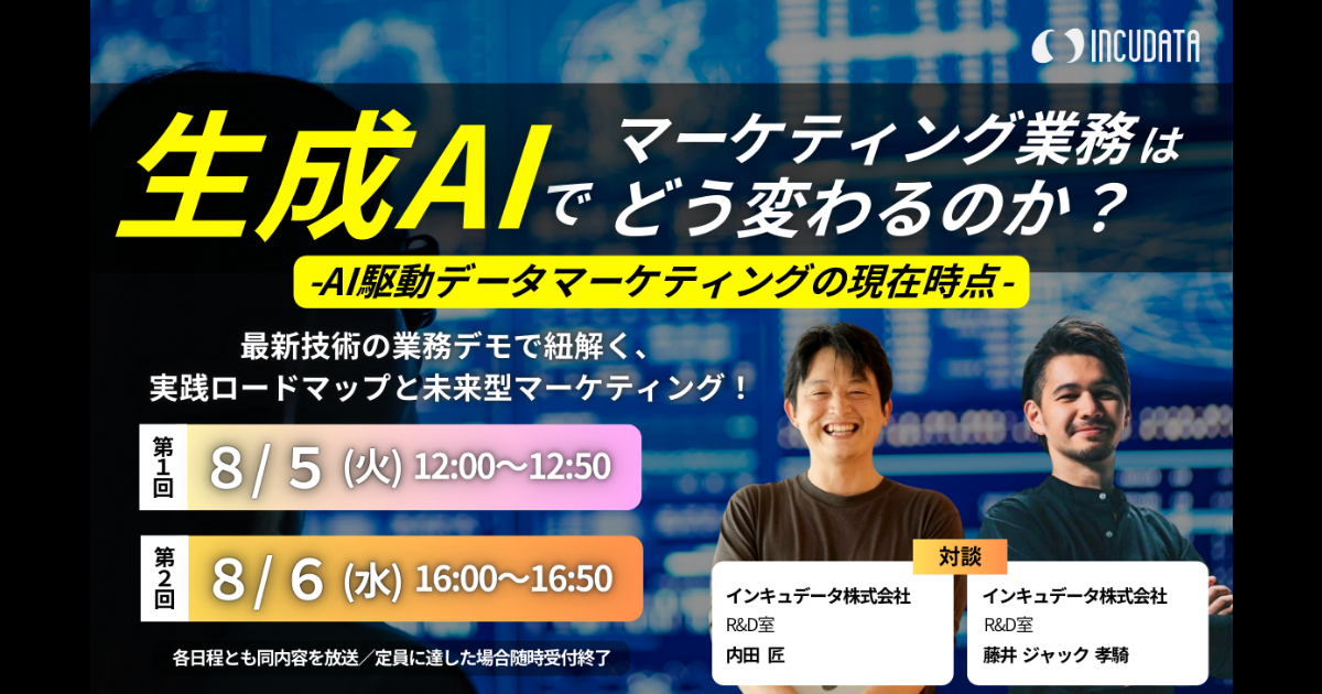 インキュデータ株式会社(本社:東京都港区、代表取締役社長 兼 CEO:町田 紘一、以下「インキュデータ」)は、生成AIによるマーケティング業務の革新をテーマにした無料オンラインセミナー「生成AIでマーケティング業務はどう変わるのか?AI駆動データマーケティングの現在時点 〜最新技術の業務デモで紐解く、実践ロードマップと未来型マーケティング〜」を、2025年8月5日(火)および8月6日(水)に開催いたします。