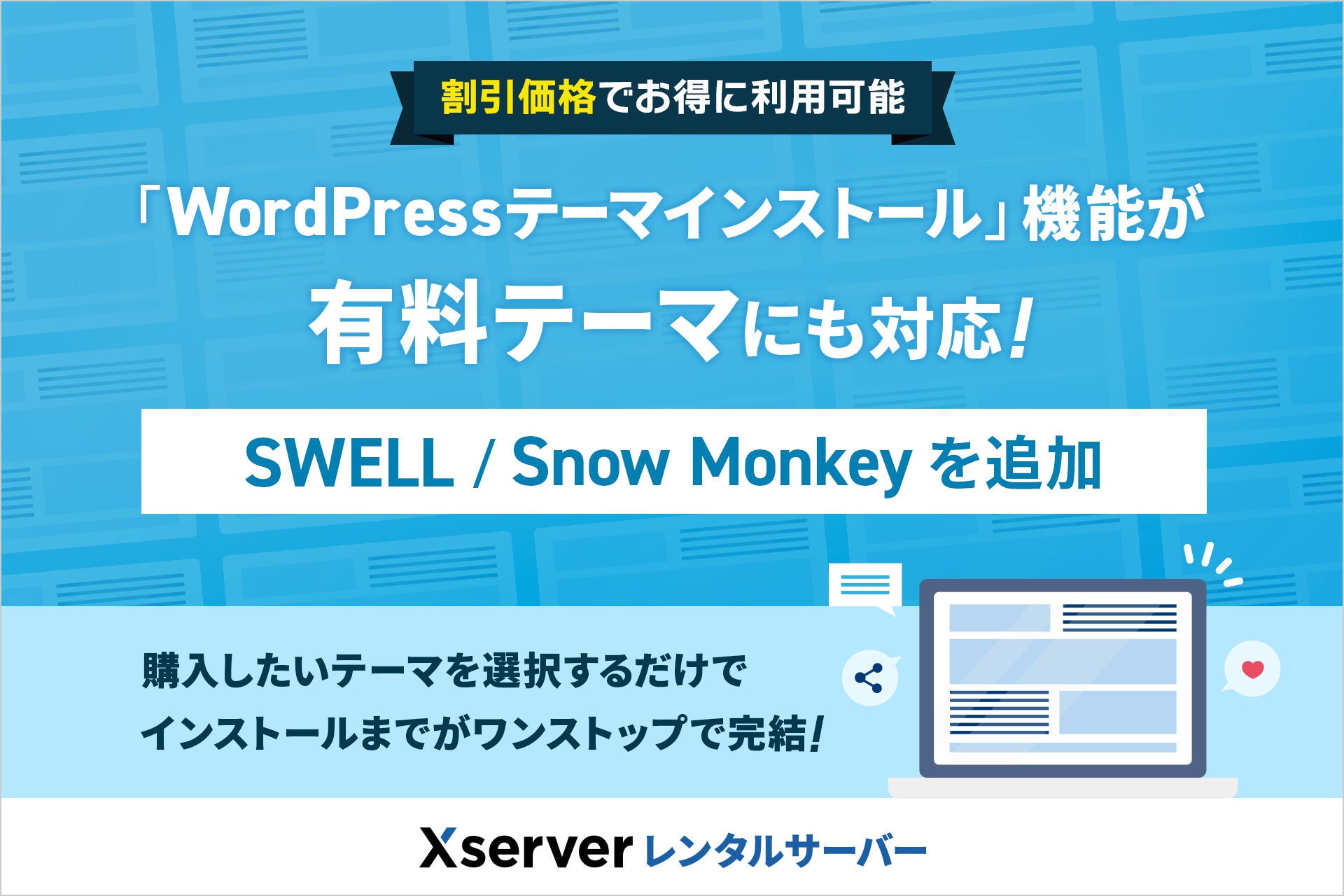 エックスサーバー株式会社(所在地:大阪市北区、代表取締役:小林 尚希)は2023年3月23日、「WordPressテーマインストール」機能において、大人気の有料WordPressテーマ「SWELL」と「Snow Monkey」の提供を開始しました。
