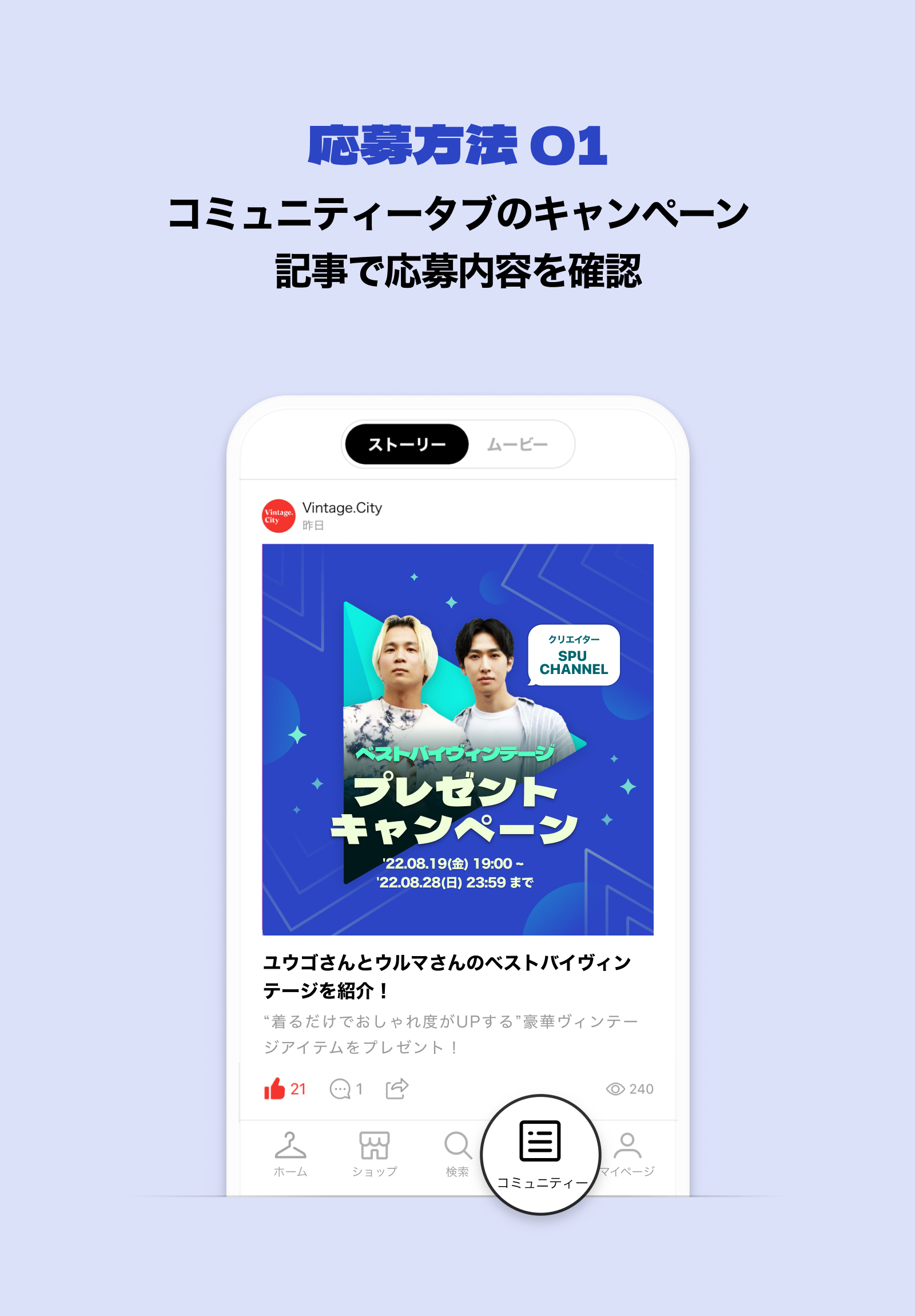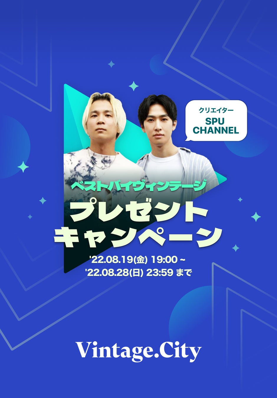 詳細はYoutubeチャンネル「SPUCHANNEL」の動画内で発表いたします。応募はVintage.Cityアプリ内で2022年8月19日(金)19:00 - 8月28日(日)23:59まで実施し、当選者もアプリ内にて8月29日(月)19:00に発表いたします。