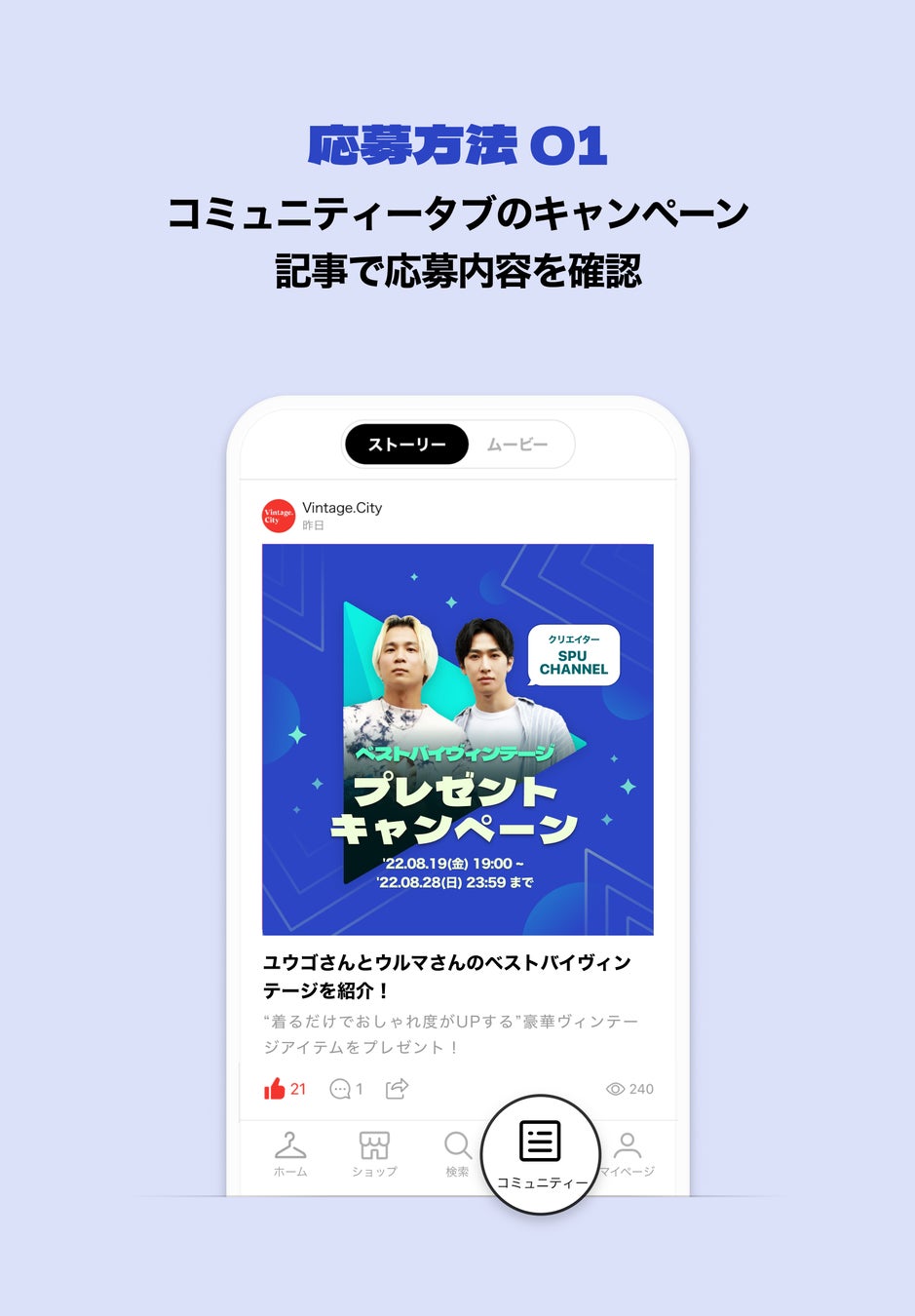 日本初のヴィンテージ・ファッション・アプリ「Vintage.City(ヴィンテージ・シティ)」内の「コミュニティ」ページに公開される「キャンペーン記事」で応募内容を確認。