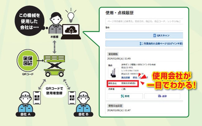 本機能は、従来実現が困難であった、建設現場での複数業者が使用する高所作業車などのレンタル商品の使用者管理を「登録作業の簡素化」と、「登録履歴のデータ化」により実現いたします。