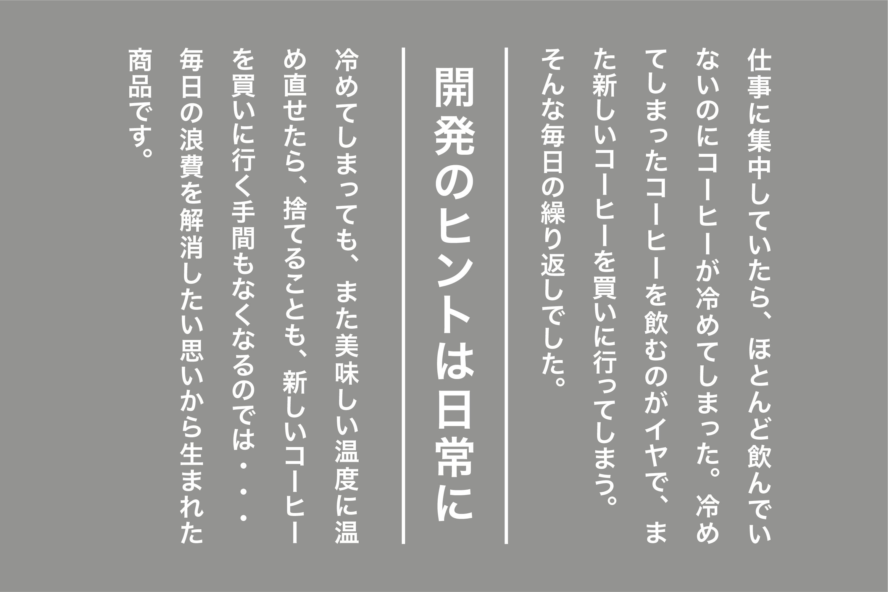 コンビニで煎れたてのコーヒーを毎朝買うものの、電話やメール、会議が立て込み、いざ飲もうと思った時には既に冷めきってしまう。お昼になったらまた新しいコーヒーを買い、冷めてしまっているコーヒーはデスクに置き去りに、、。そんな毎日の繰り返しでした。