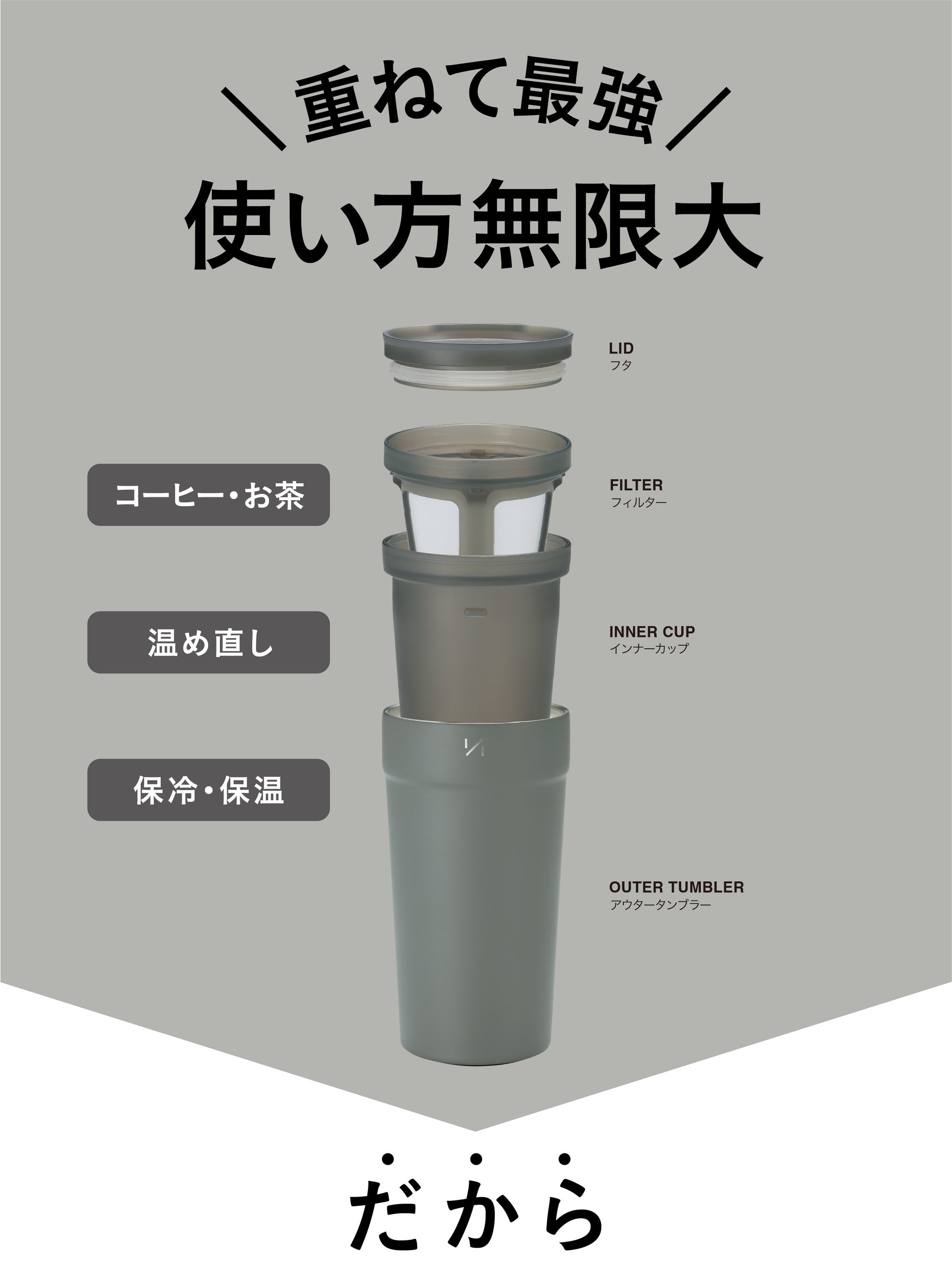 飲み物が冷めてしまっても、インナーカップを外して電子レンジでチンすれば、また美味しい温度に温められる構造になっています。