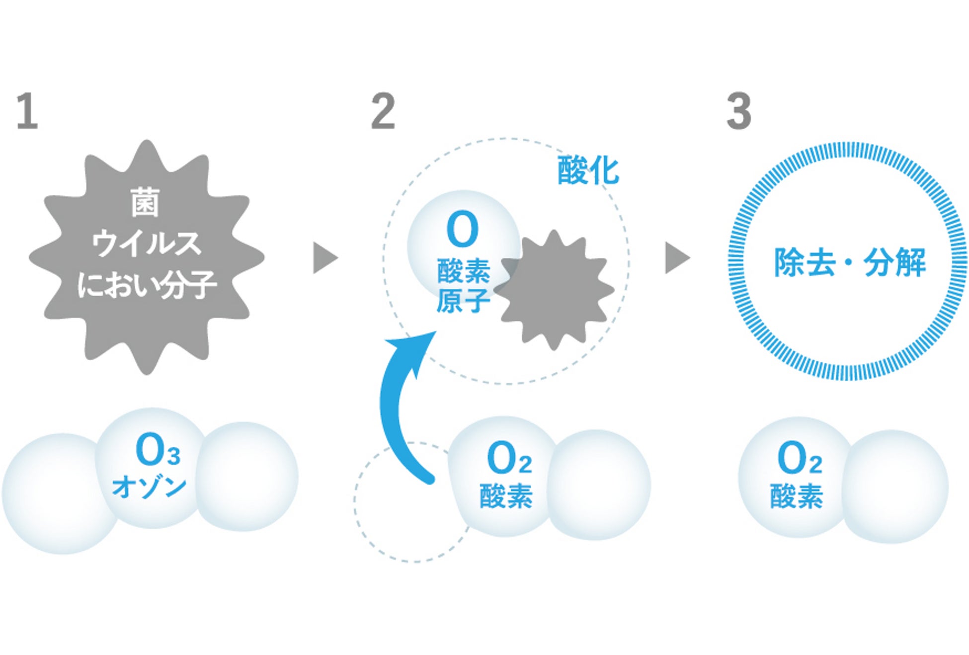 ※オゾンとは:大気の自浄作用を担っている自然界に存在する気体です。オゾンは3つの酸素原子で成っており、そのうちのひとつが近くの菌やウイルスなど別の物質と強く結び付くことで酸化し、悪臭の元になる分子を完全に破壊、分解する性質があります。そのため、より効果の高い除菌・消臭効果があることが実証されています。