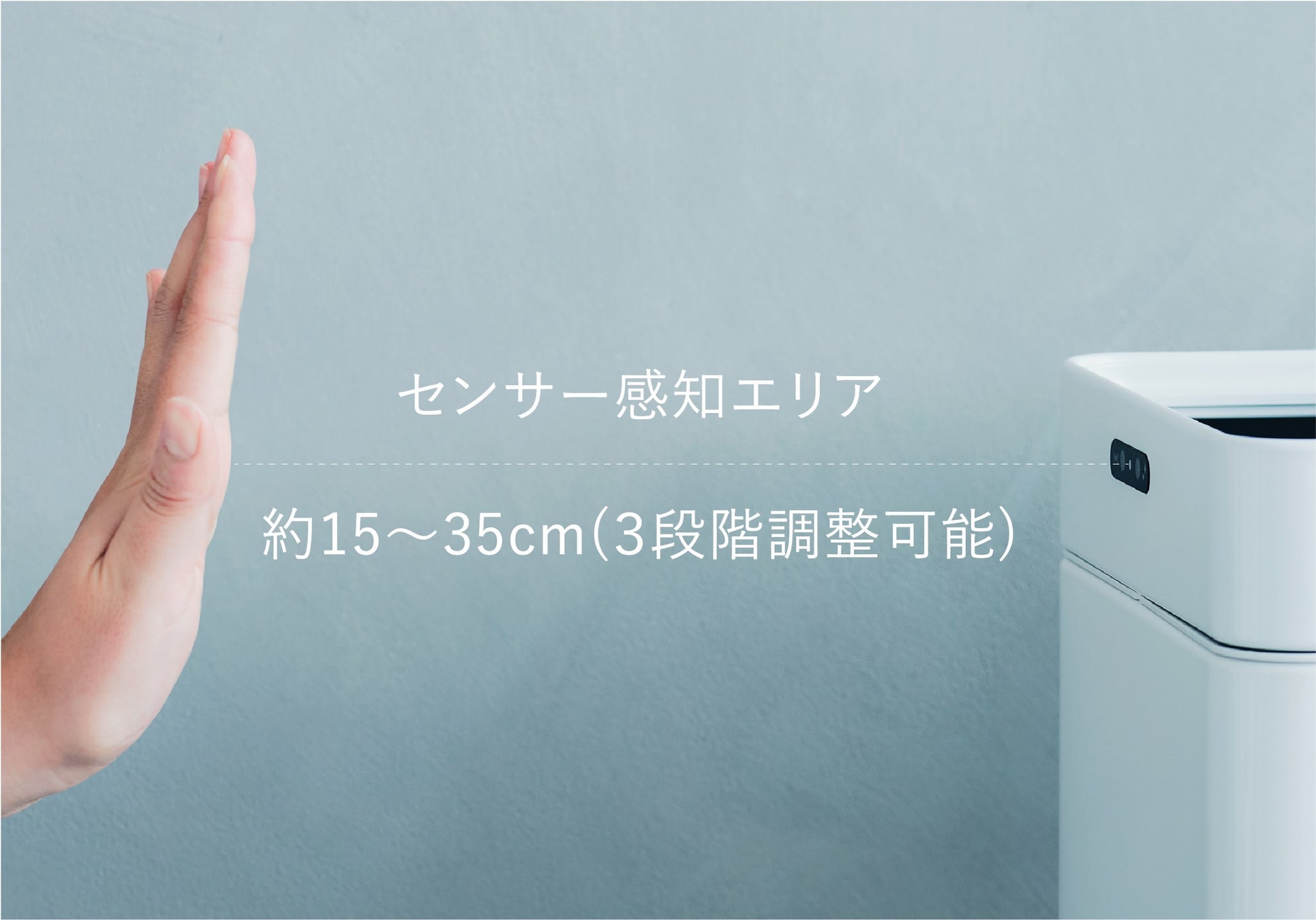 人感センサーを搭載し、ふたの前に手をかざすだけで、自動でふたが開きます。センサーの感知エリアは約15~35cmの間で3段階に調整できるようになっており、ストレスフリーなゴミ捨てを叶えます。タッチスイッチに軽く触れると、手動で開閉も可能です。