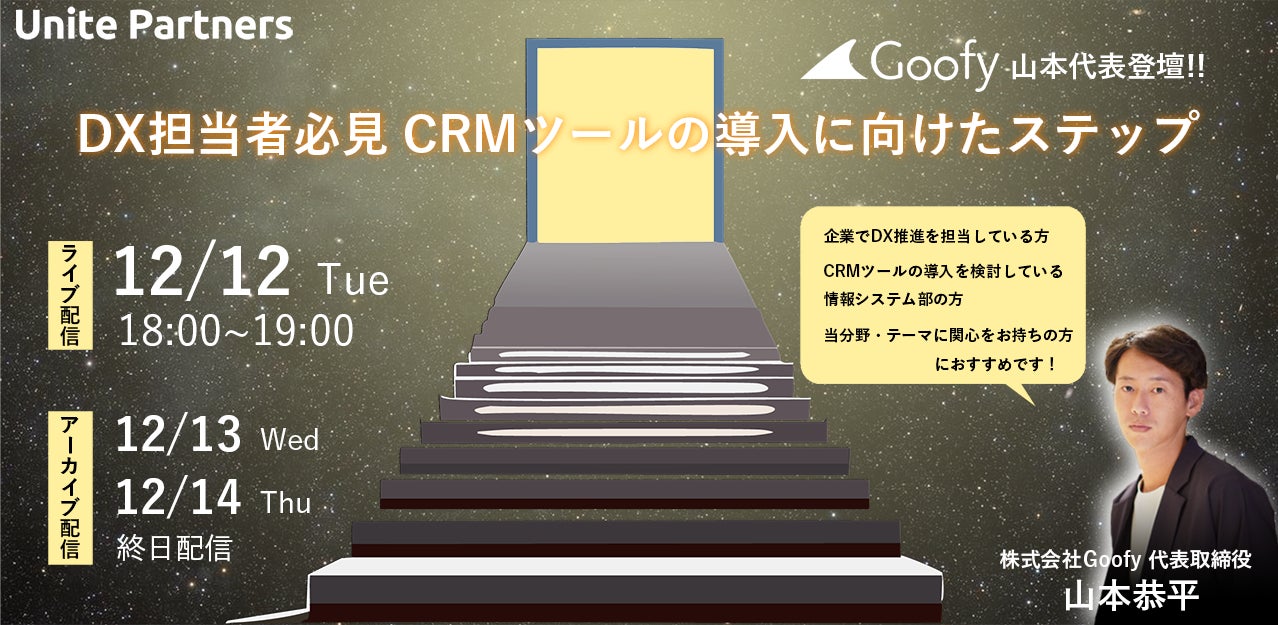 企業の変革パートナーを目指すブティック型コンサルティングファームのUnite Partners株式会社(本社:東京都、代表取締役:小林大輝)は、2023年12/12〜14 に、「【Goofy山本代表登壇】DX担当者必見!CRMツールの導入に向けたステップ」と題して大企業のDX担当者向けのセミナーを開催します。
