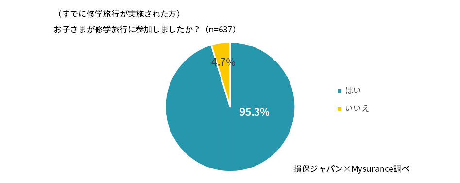 損害保険ジャパン株式会社(代表取締役社長:西澤 敬二、以下「損保ジャパン」)の子会社で「修学旅行キャンセル保険」を提供するMysurance株式会社(代表取締役社長 川上 史人、以下「Mysurance」)は、損保ジャパンと共同で「コロナ禍の修学旅行の参加実態調査」を行いましたので、その結果を公表します。