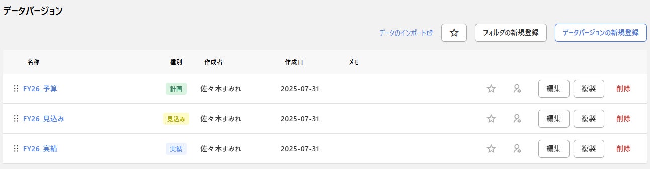従来の「計画バージョン」管理を発展させ、新たに「データバージョン」機能を搭載しました。 これにより、従来は「計画」属性が中心でしたが、今後は「見込み」や「実績」といった属性をユーザーが自由に設定できるようになります。例えば、「実績」データを複数パターン保持・比較するといった柔軟な運用も可能です。