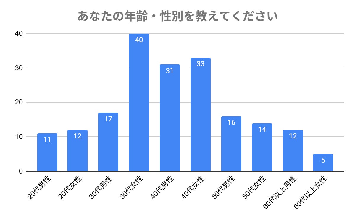 上記のデータは、今回のアンケート調査に協力していただいた回答者の年齢・性別の内訳を示しています。
