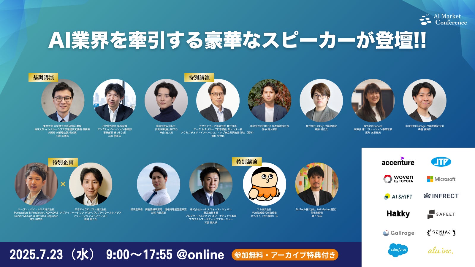 当日は、JTP社に加え、内閣府AI戦略会議 構成員を務める東京大学川原教授、アクセンチュアAIセンター長 保科氏の他、日本マイクロソフト社やウーブン・バイ・トヨタ社など豪華な講演者が多数登壇します!