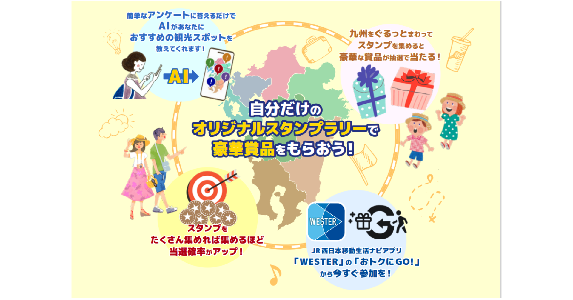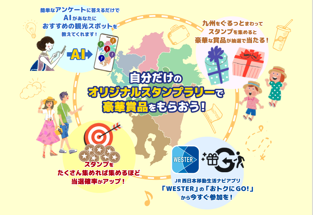 本取組は、AIを活用して自分だけのオリジナルのスタンプシートを作成し、九州各地の観光地やD&S列車など九州の魅力を楽しむデジタルスタンプラリーで、九州観光機構とJR西日本、JR九州が共同で企画する初めての取組となります。