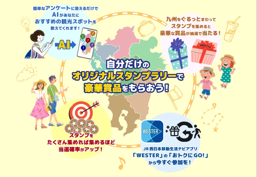 一般社団法人九州観光機構(福岡市中央区、会長:唐池恒二、以下「九州観光機構」)、西日本旅客鉄道株式会社(本社:大阪市北区、代表取締役社長:長谷川一明、以下「JR西日本」)、九州旅客鉄道株式会社(本社:福岡市博多区、代表取締役社長執行役員:古宮洋二、以下「JR九州」)は、三社で協力して、移動生活ナビアプリ「WESTER」を活用した「AIして!九州 2022スタンプラリー」を実施いたします。