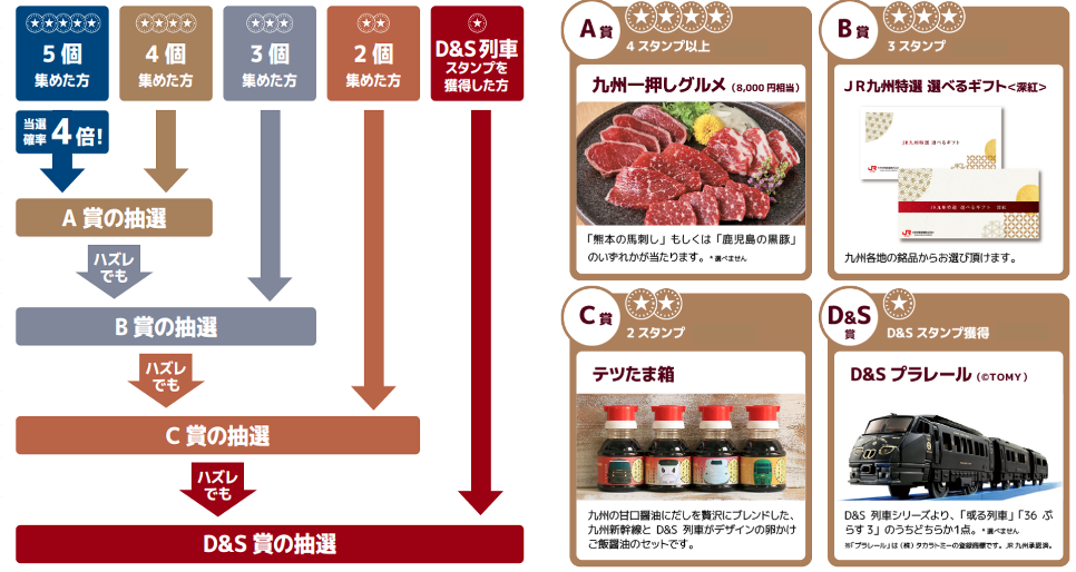 賞品: A賞 4スタンプ以上(10名)・・・ 九州の名産グルメ(馬刺し、黒豚 等)