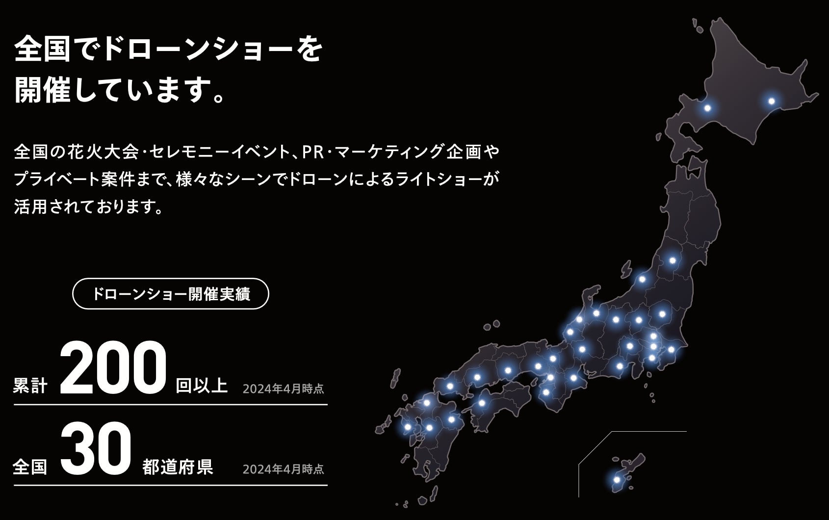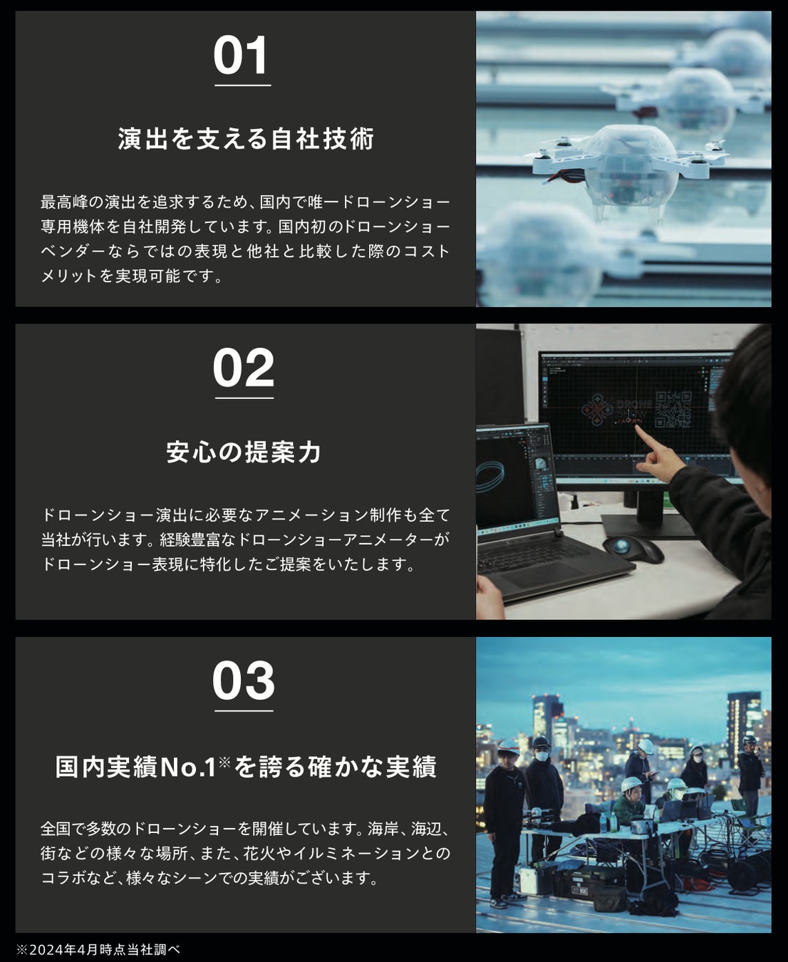 ※ 日本国内におけるドローンショー実施回数実績として、2024年4月時点当社調べ。