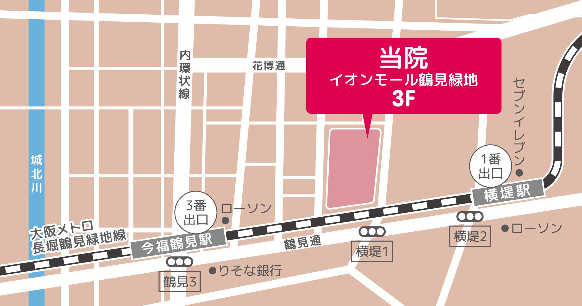 大阪メトロ長堀鶴見緑地線「今福鶴見駅」3番出口、「横堤駅」1番出口から徒歩約8分の「イオンモール鶴見緑地」3階で、朝9時から夜21時まで、土日祝日も毎日診療を行います
