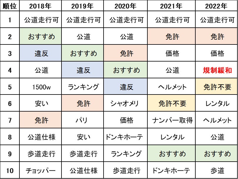 「電動キックボード」の検索者数の推移をみると、グラフの通り年々増加しておりニーズの高まりを示す結果となりました。また、「電動キックボード」と一緒に検索されているワードのランキングをみると、「公道走行可」が2018年から常に1位という結果となりました。その他には、2022年に公布された道路交通法の改正(2023年7月施行)で、一定の条件を満たすことで「免許不要」となることや、着用が努力義務となる「ヘルメット」なども多く検索されています(※)。