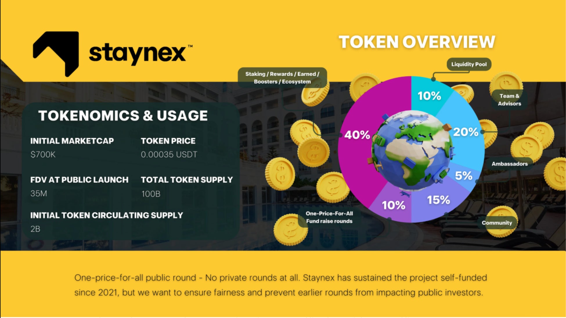 Staynexのエコノミーシステムは、ネイティブトークンである$STAYを基盤としています。このトークンは、ユーザーがStaynexプラットフォーム内でさまざまなサービスにアクセスする際に使用され、特典や報酬を得るための重要な役割を果たします。