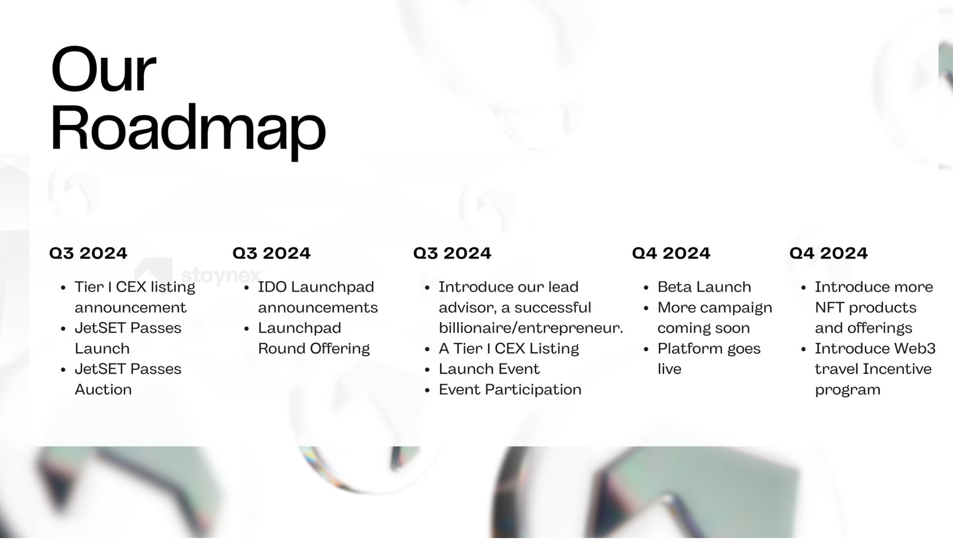 Staynexのロードマップには、2024年以降のグローバル展開とさらなる機能の充実が含まれています。特に、モバイルアプリのリリースやAIを活用したパーソナライズド旅行提案の導入など、ユーザー体験の向上を目指した取り組みが進められています。