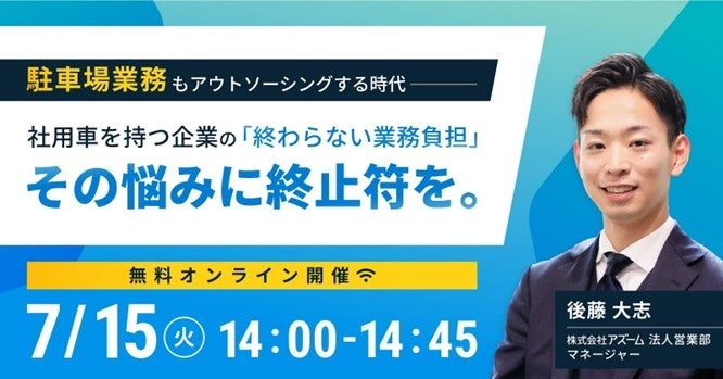 株式会社アズーム(本社:東京都渋谷区代々木、代表取締役社長:菅田洋司、以下:アズーム)は、7月15日(火)14時より、無料オンラインセミナー「駐車場業務もアウトソーシングする時代―社用車を持つ企業の『終わらない業務負担』その悩みに終止符を。」を開催いたします。
