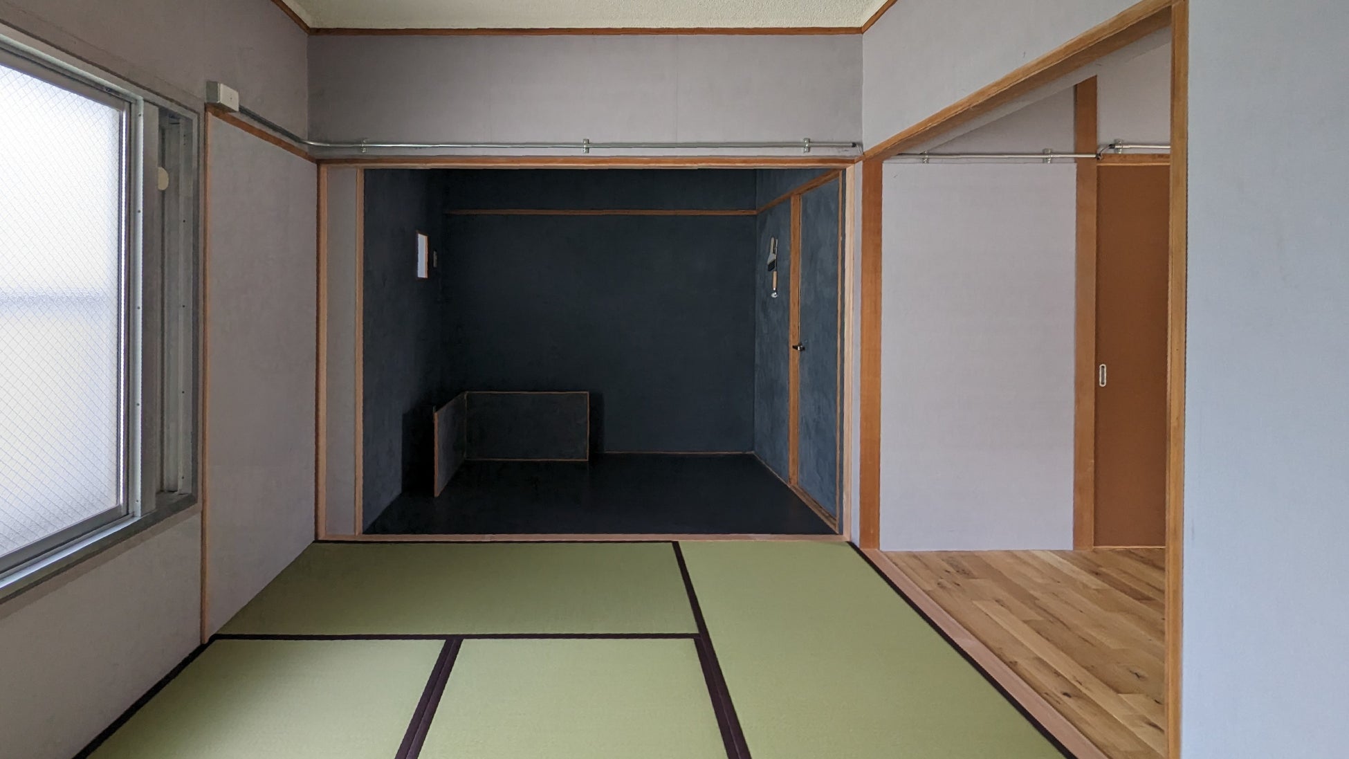 今回の改装では、それぞれの部屋の床をフローリング、畳、Pタイルで構成しました。壁面のやすりのザラザラとした質感と同時に、足元の質感のバリエーションを、生活の中で楽しんでもらえたらと思っています。
