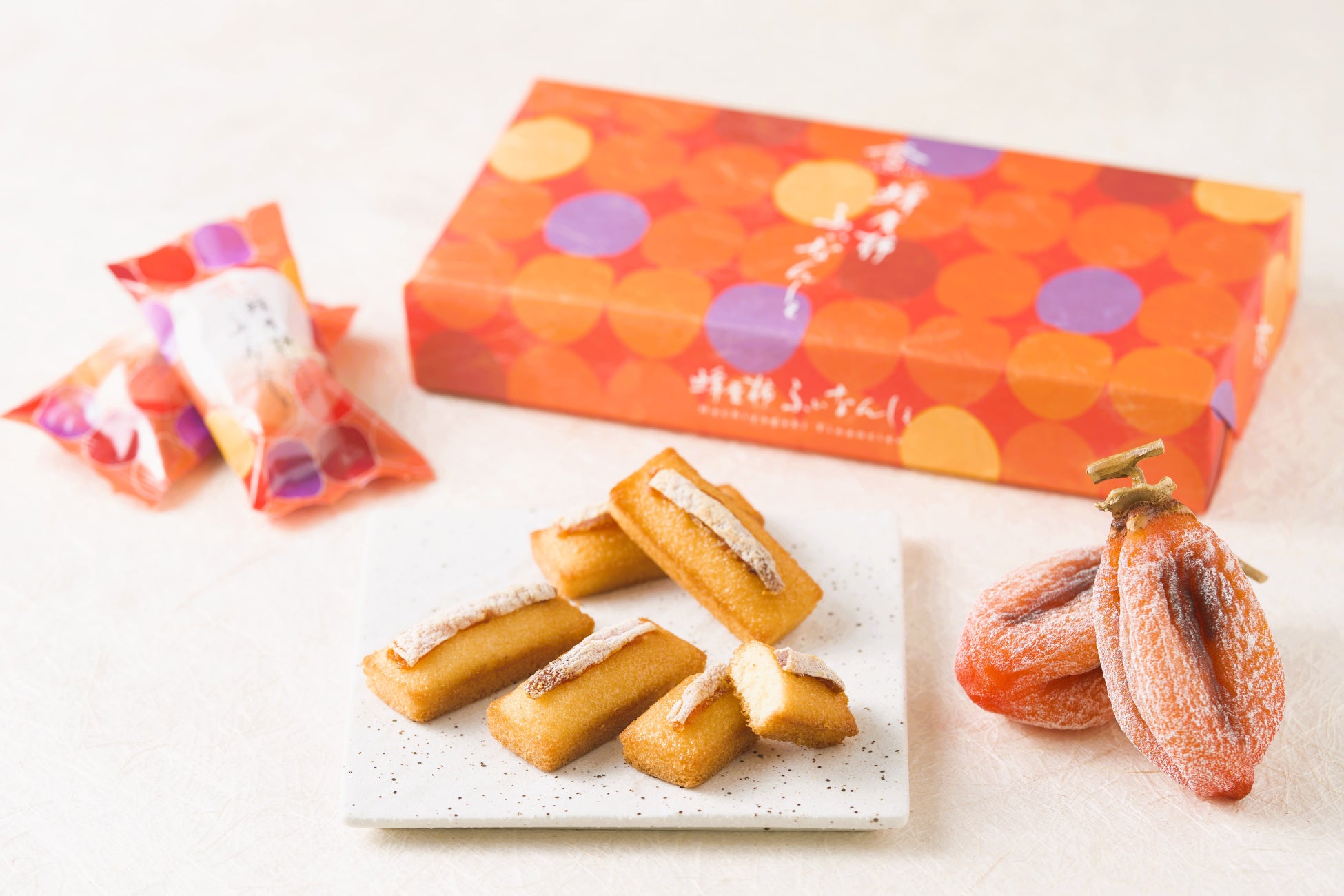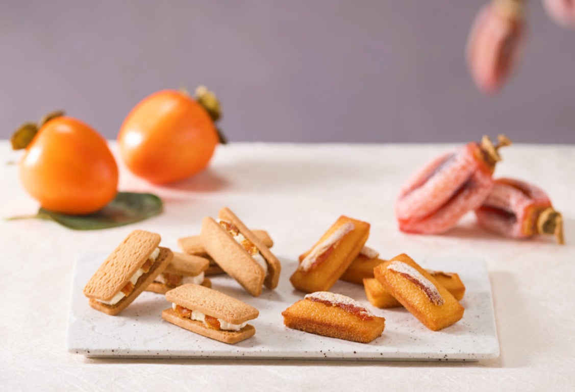 バターの濃厚な風味と香ばしいアーモンドプードルの香りが広がるふぃなんしぇ。生地の食感をより良くするため改良しました。カットした蜂屋柿の果肉をトッピングした、贅沢で特別感のあるお菓子に仕上げました。