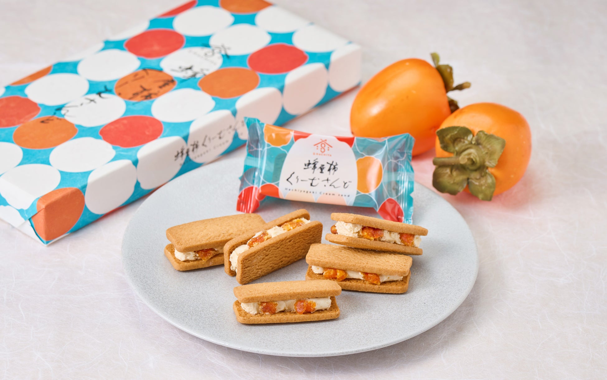 ホワイトチョコと細かく刻んだ干し柿を練り込んだコクのあるバタークリームを、しっとりと焼き上げたクッキーでサンドしました。口当たりの良いクリームになるよう改良しました。仕上げに果肉の食感をしっかりと味わえるサイズの蜂屋柿をトッピングしています。