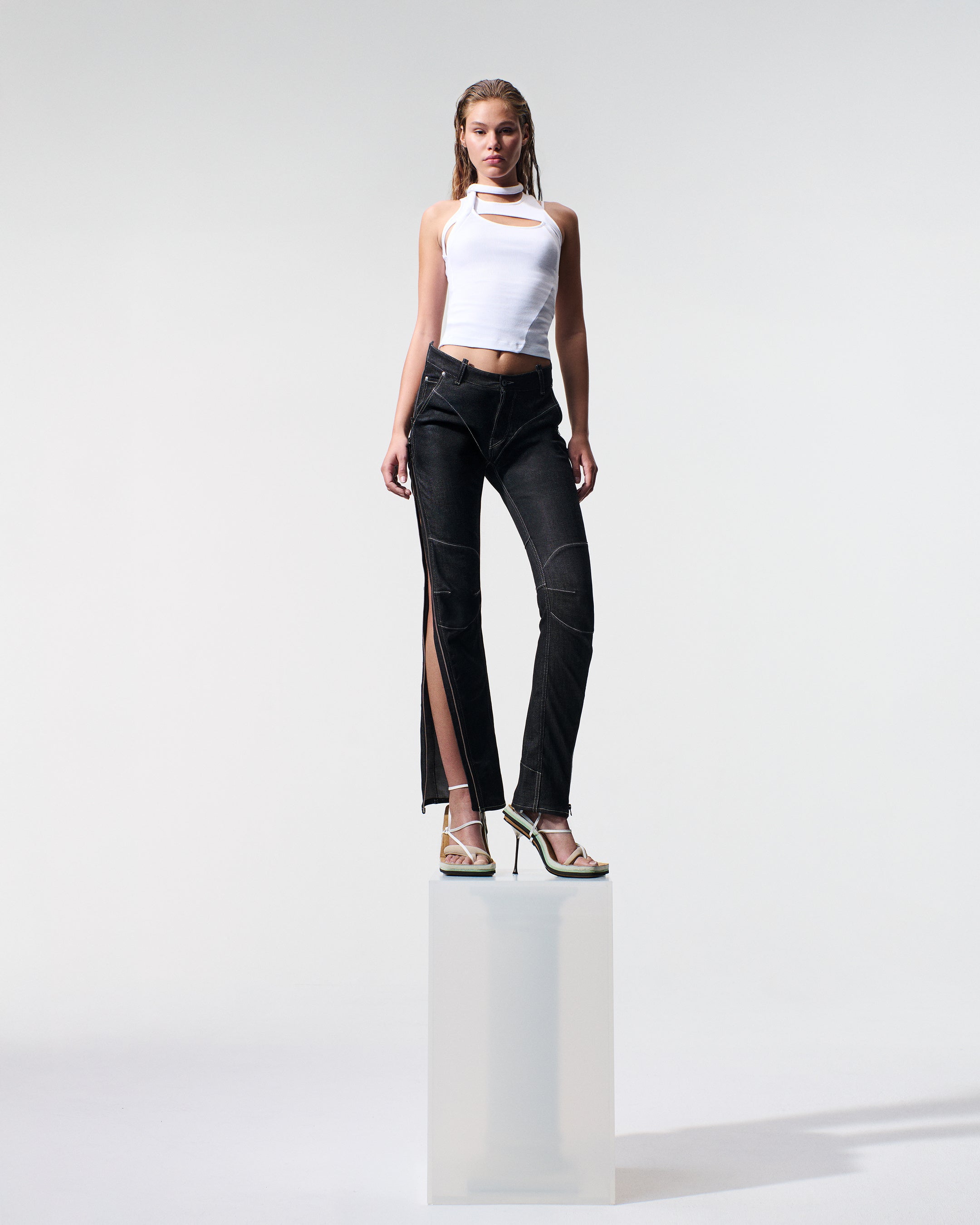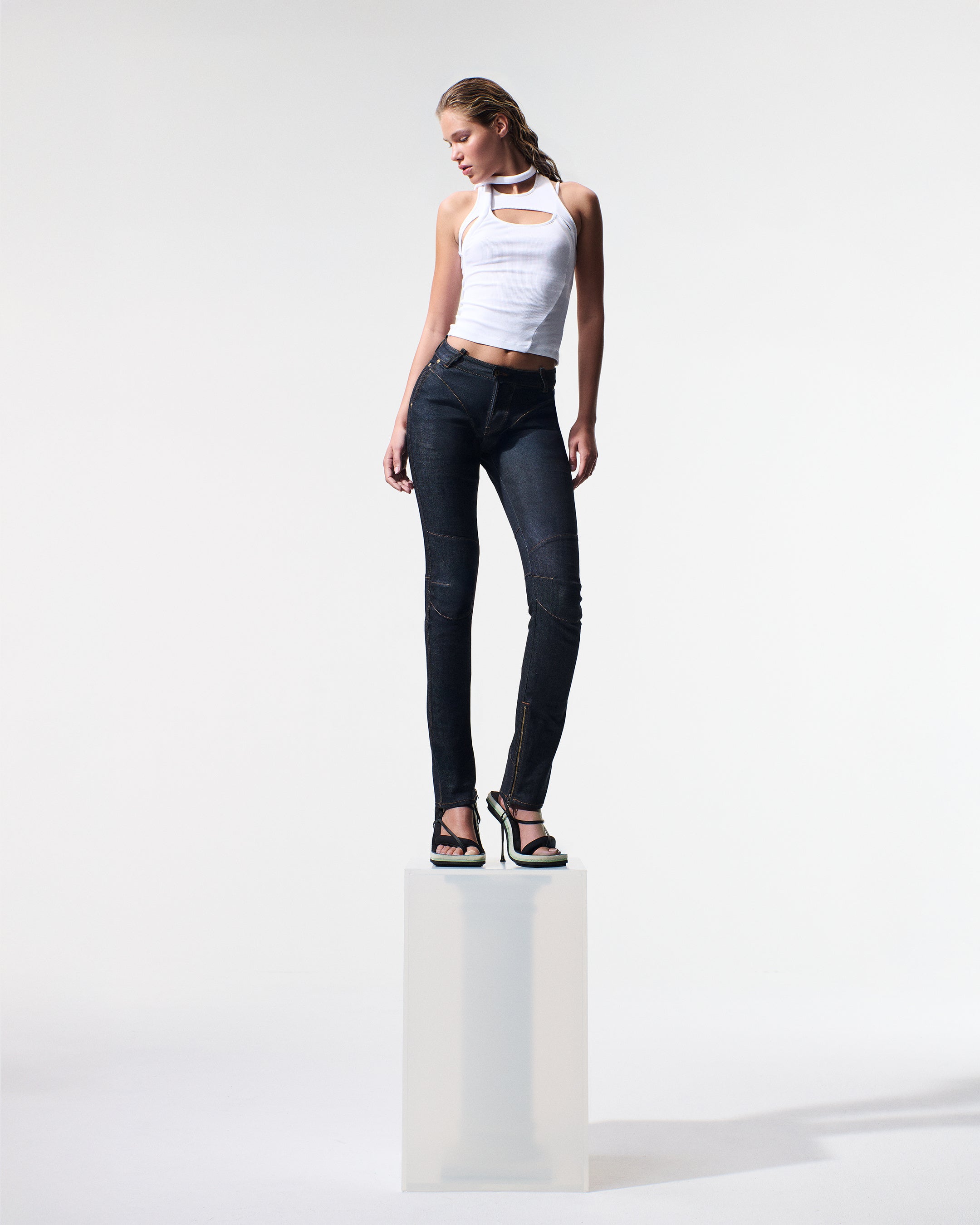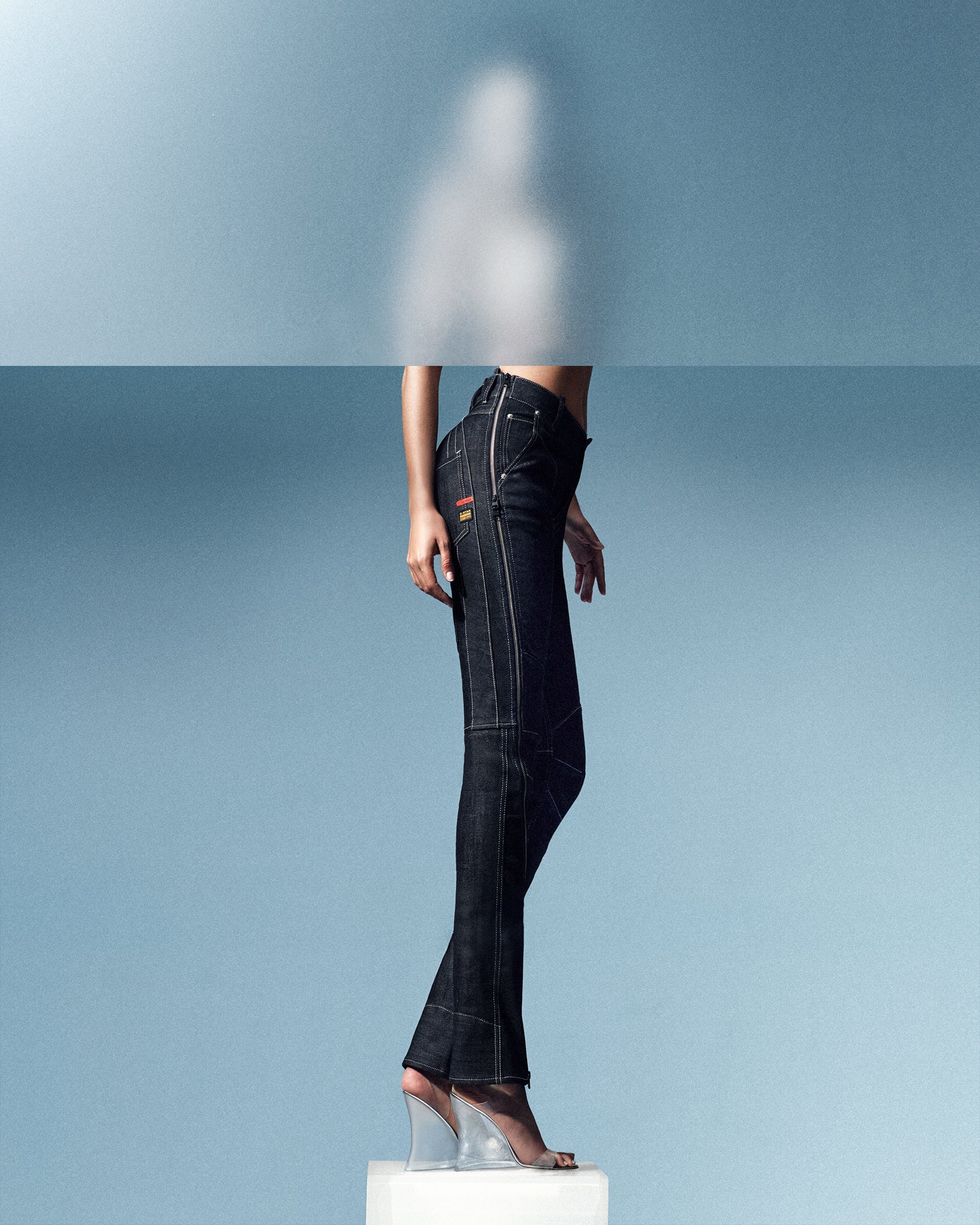 ベルリンを拠点として活動するオットリンガーが、本シリーズの第一弾となるジーンズを制作しました。二人組デザイナーである彼女たちは今回、型にはまらない自由なビジョンで従来のジーンズのかたちを見直し、G-STAR Elwoodを新たな解釈で作り変えました。ニーパッドや特徴的なステッチングといったG-STAR Elwoodのア イコニックな要素はそのままに、超スリムフィットに仕上げられたジーンズは、フェミニンでコンテンポラリーな印象。「THE DENIM 001」と「THE DENIM 001 Zip」の2バージョンの展開です。「THE DENIM 001」はローウエストの作りに、ゴ ールドのパーツやスティッチングを施し、下部にサイドジッパーがついています。 「THE DENIM 001 Zip」はフルレングスのサイドジッパーつきで、シルバーのパーツとスティッチングが施されたバージョンです。
