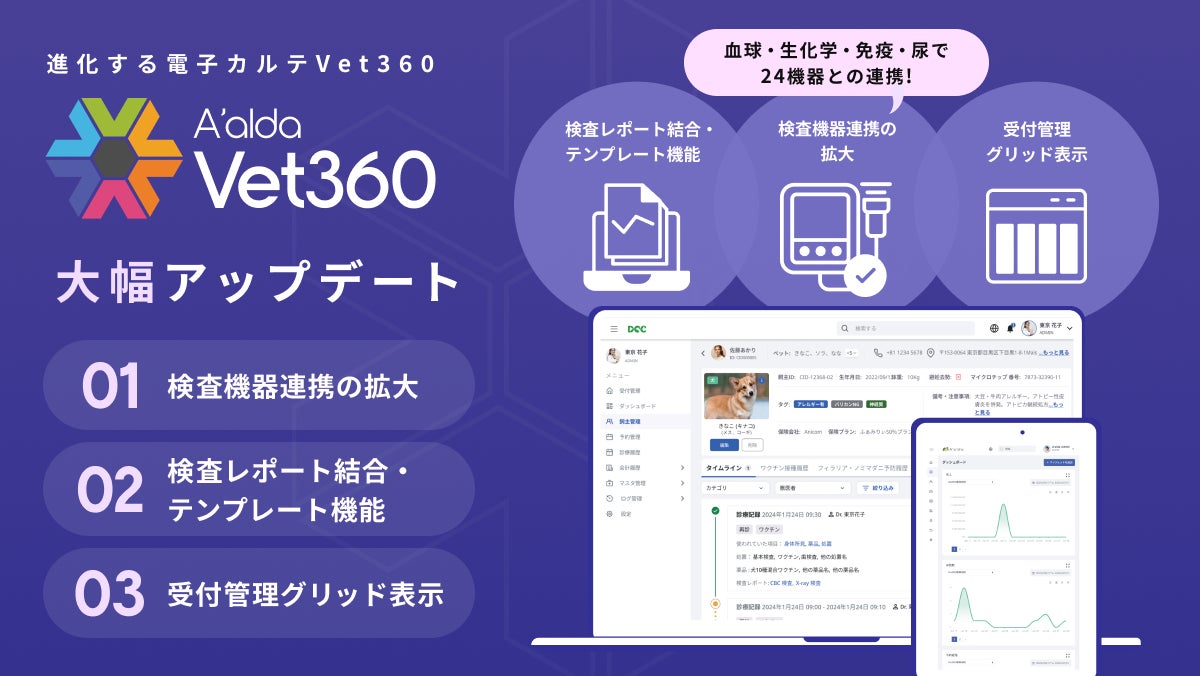 進化する電子カルテVet360を提供するA'alda Y株式会社(本社:東京都品川区、代表取締役:権 五勲、以下、アルダ)は、検査機器連携・受付管理の新機能をリリースいたしました。