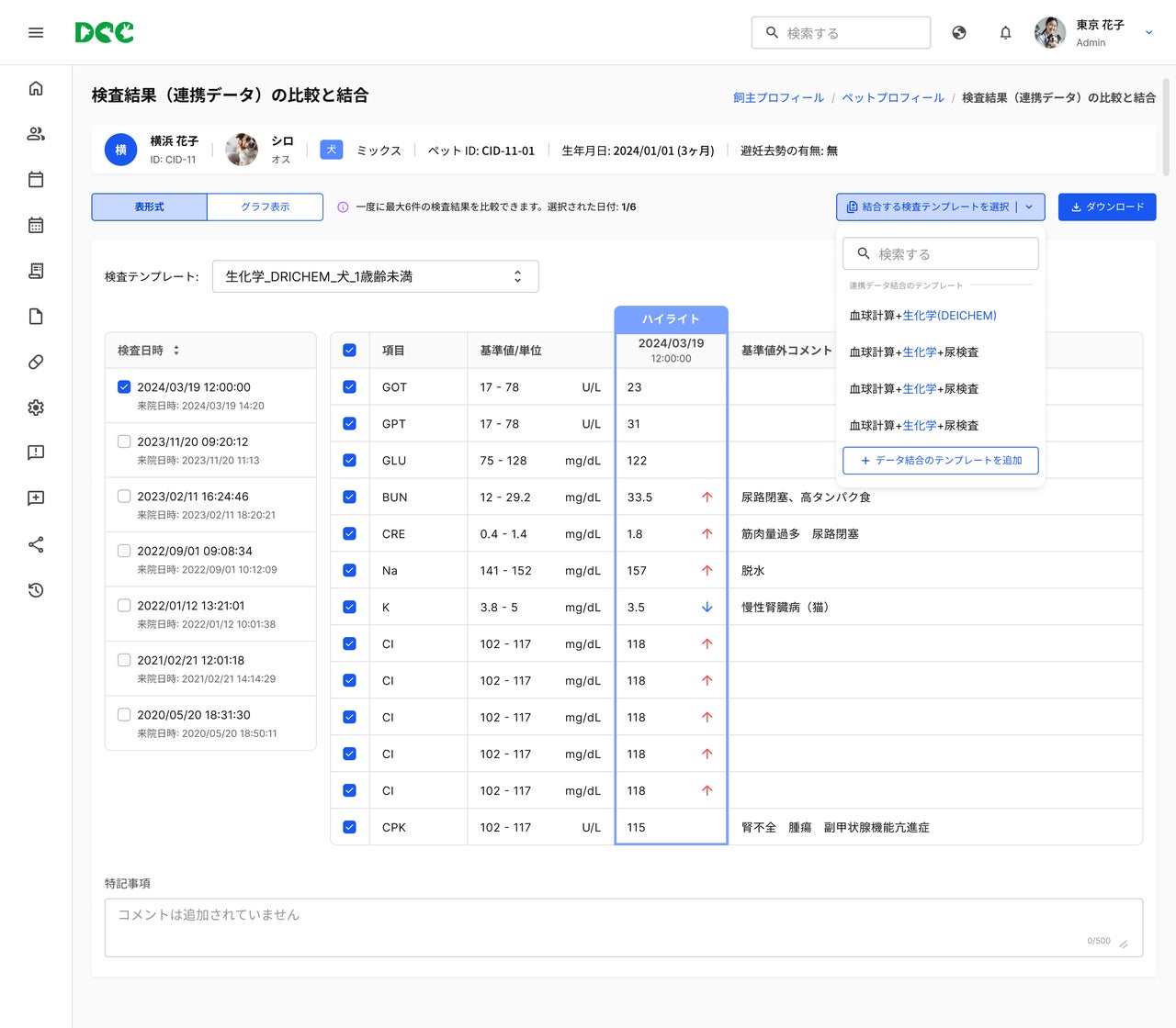 検査結果が機器側からVet360に自動で取り込まれ、また検査項目ごとにテンプレートのカスタマイズが可能です。