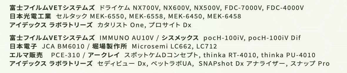 シスメックス:pocH-100iv/pocH100-iv Diff エルマ販売:PCE-310 堀場製作所:Microsemi LC662/LC712 |