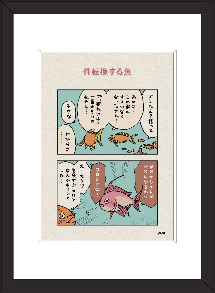 今回、同じく「楽しく学べる」展示を目指す『スマートアクアリウム静岡』のお客様にもご覧いただこうと、厳選した13作品を新たに出力・額装して出張展示することになりました。アトアでは、トイレ個室ごとに異なる作品を展示しているため全ての作品を見ることは難しいですが、静岡では、水槽を眺めながら読書を楽しめる「ディスカバリー」とニシキテグリの模様でラッピングした空間「装うエリア」に展示していますので、ゆっくりとご覧いただくことができます。