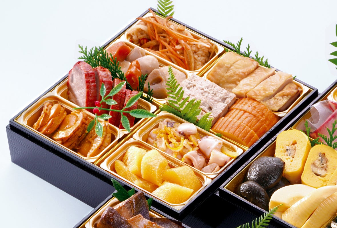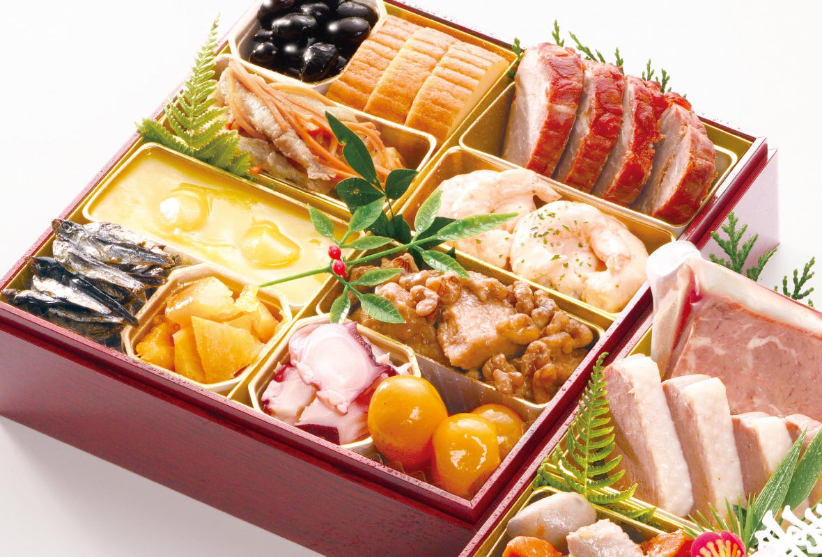 広東風チャーシュー、丹波黒豆煮、栗きんとん、海老のオーロラソース、伊達巻、鶏肉とくるみのオイスターソース、わかさぎ南蛮漬、田作り、柚子甘露煮、たこ梅酢、きんかんみつ煮