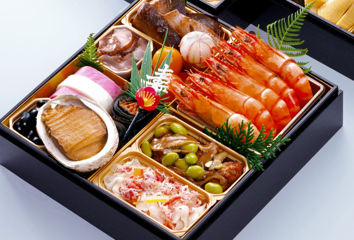 天然ぶりの照焼、柚子とかにの紅白なます、煮あわび、紅白かまぼこ、有頭海老煮、丹波黒豆煮、阿波尾鶏つくねあんかけ、きんかんみつ煮、国産赤なまこ酢、紅鮭昆布巻、手毬餅
