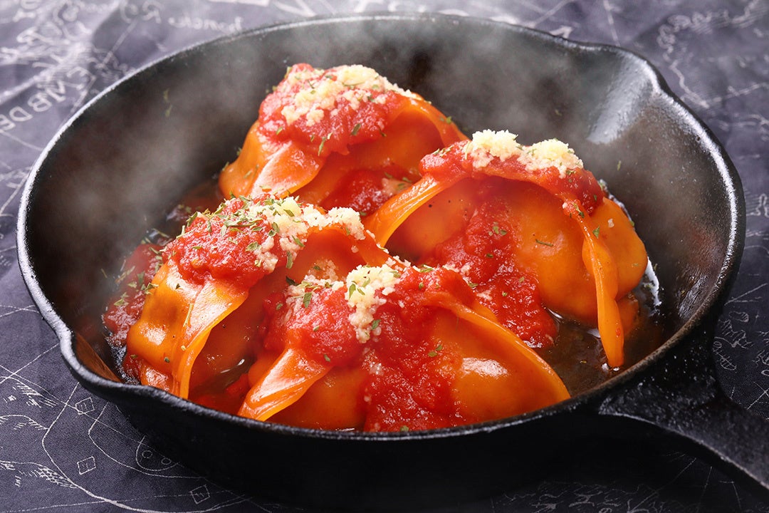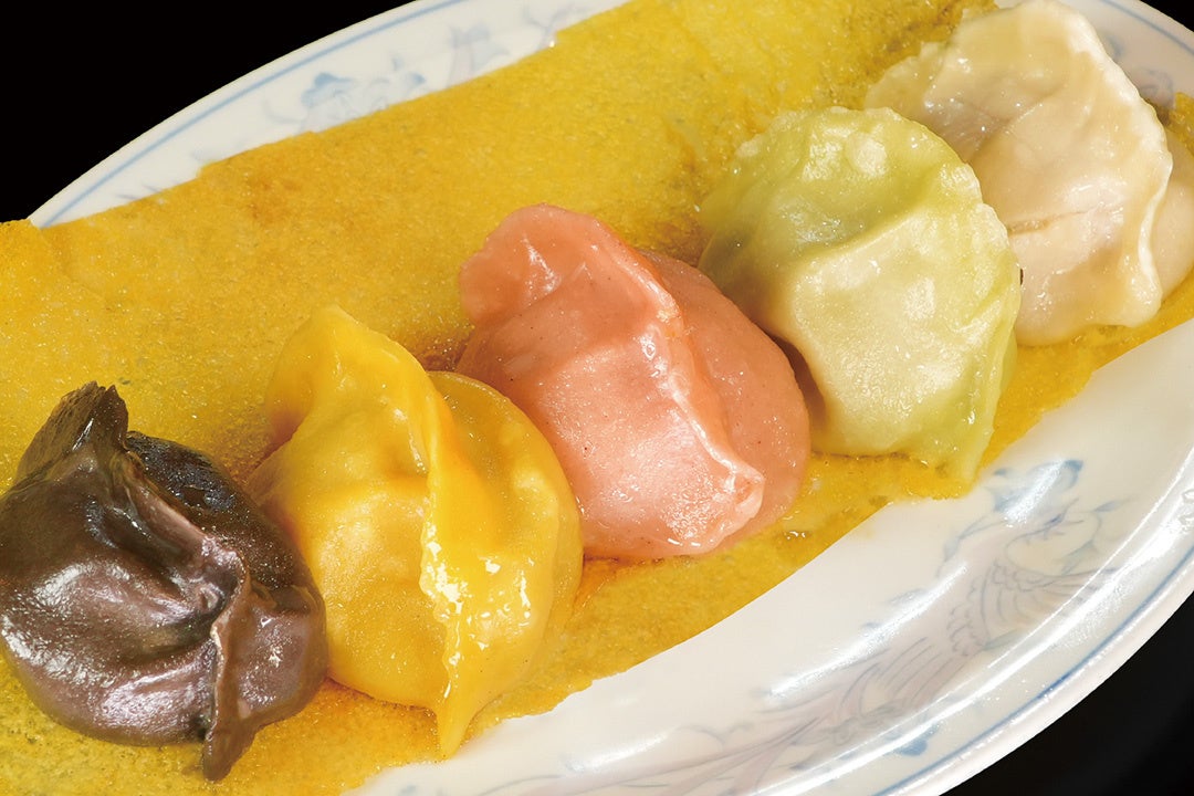 一皿の中に選ぶ楽しさも詰め込んだのは【餃子百珍 一味玲玲】の「焼き餃子の5色食べ比べ」と「水餃子の5色食べ比べ」。豚肉の餡をベースに黄=ホタテ、白=白菜、黒=しいたけ、緑=ニラ、赤=エビが包み込まれる彩り豊かな5色餃子は、焼き or 水、気分に合わせて召し上がれ。 イタリア料理のエッセンスを取り入れた【ワインと点心TUITUI】の「イタリアン!トマト餃子アラビアータ!」は餃子の皮をパスタに見立てるという変化系で本格アラビアータを再現。鮮やかな緑の皮に包まれている「もちもち!ほうれん草カレー餃子!」はカレー風味の餡に7種のスパイスをブレンドし、揚げエシャロットやハーブをトッピングした香りまで美しい。 埼玉の餃子専門店【餃子の宮でんでん】の「チーズのせ爆汁丸餃子」は、ぷるんとした皮が特徴の丸餃子にチーズソースを絡めた人気餃子は、口の中いっぱいにアツアツ肉汁が溢れ出す。