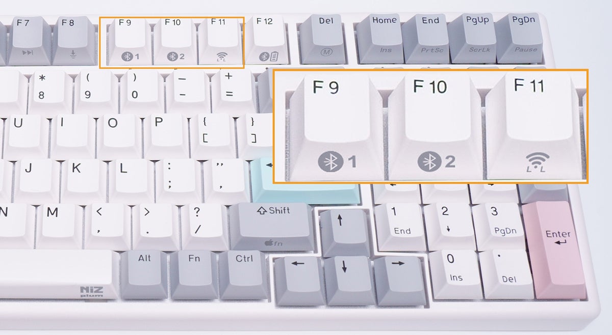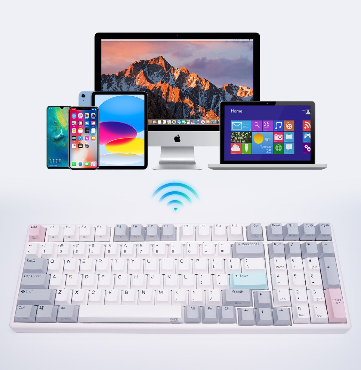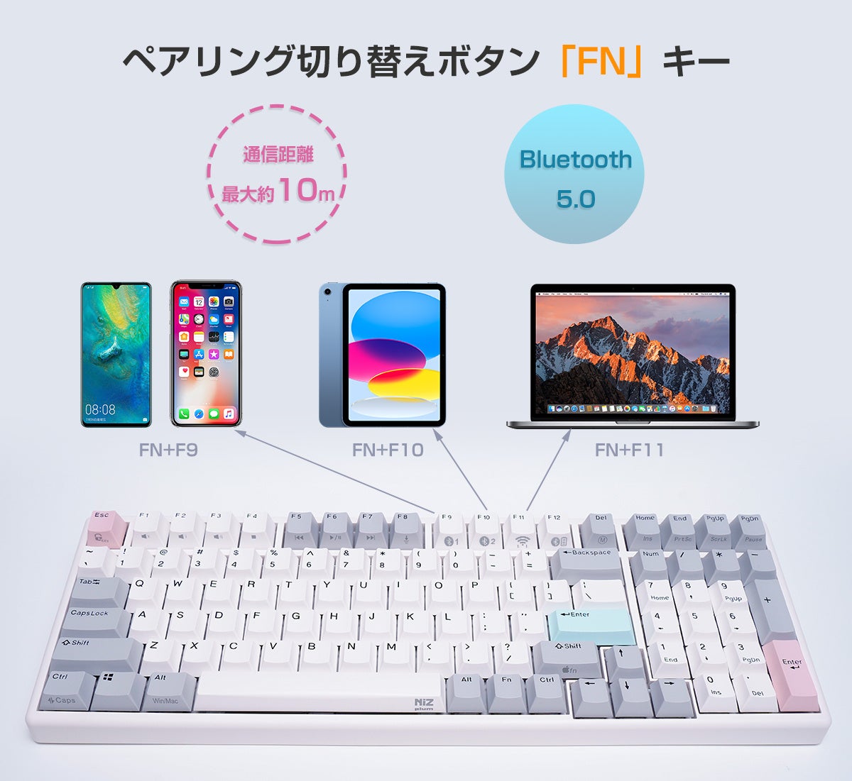 2023年2月にmakuakeにて先行販売の有線X99キーボードのプロジェクトが発売されてから、548人の方から応援購入をいただき、目標金額の2276%を達成しました!幅広い大好評を受けました。多くのお客様からは、無線Bluetooth接続がいつ提供されるのかについて問い合わせがありました。当社の技術チームと生産部門の共同の努力の結果、NIZ最強の進化版モデルBluetooth5.0/USBレシーバー/有線の3WAY接続可能な機能を備えたキーボードがついに登場しました。Bluetooth機能により、2台のデバイスを同時に接続することができ、さらにUSBレシーバーも同時に接続でき、有線も合わせると、4つの端末を1つのキーボードで操ることができます。そして、有線接続と無線接続の切り替えもワンボタンで簡単に行えます。
