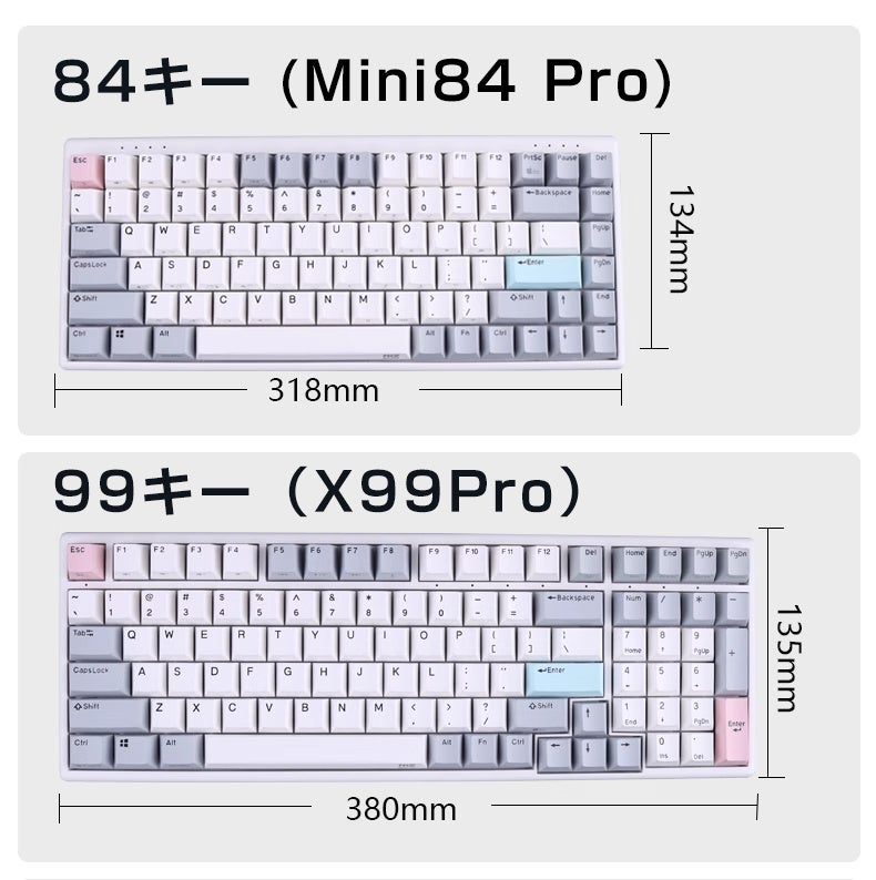 今回makuakeにて、88キー(Mini84 Pro)と99キー(X99Pro)2つの製品が選択肢として提供されています。自分の好みに合ったモデルを選んでください。