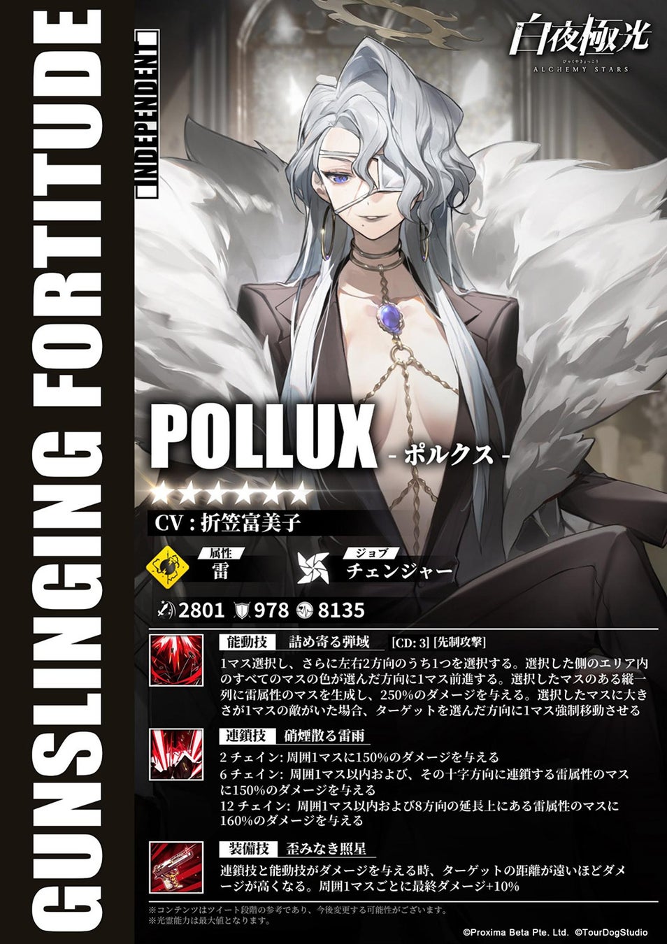 今回のアップデートで、前回の期間限定召集【レイヴンズ・ブラッド】に登場した★6光霊ポルクスと★5光霊キャスタが期間限定召集【銀幕の万華鏡】、【幻影の牛鬼】、通常ノーマル召集および以降すべての期間限定召集の光霊リストに追加されます。排出率は同じレア度の他の光霊と同じです(排出率アップ対象を除く)。