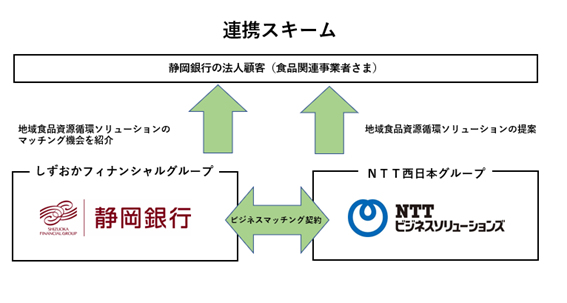 一方、NTTビジネスソリューションズでは、従前より、循環型で持続可能な地域社会の実現に向けたソリューションを展開して参りました。そして、このたび、静岡銀行と連携し、同行グループのネットワークを通じて、食品資源循環のニーズを有する地域企業をご紹介いただき、ソリューション提供を通じたご支援を行うことを目的に、静岡銀行と本契約を締結いたしました。