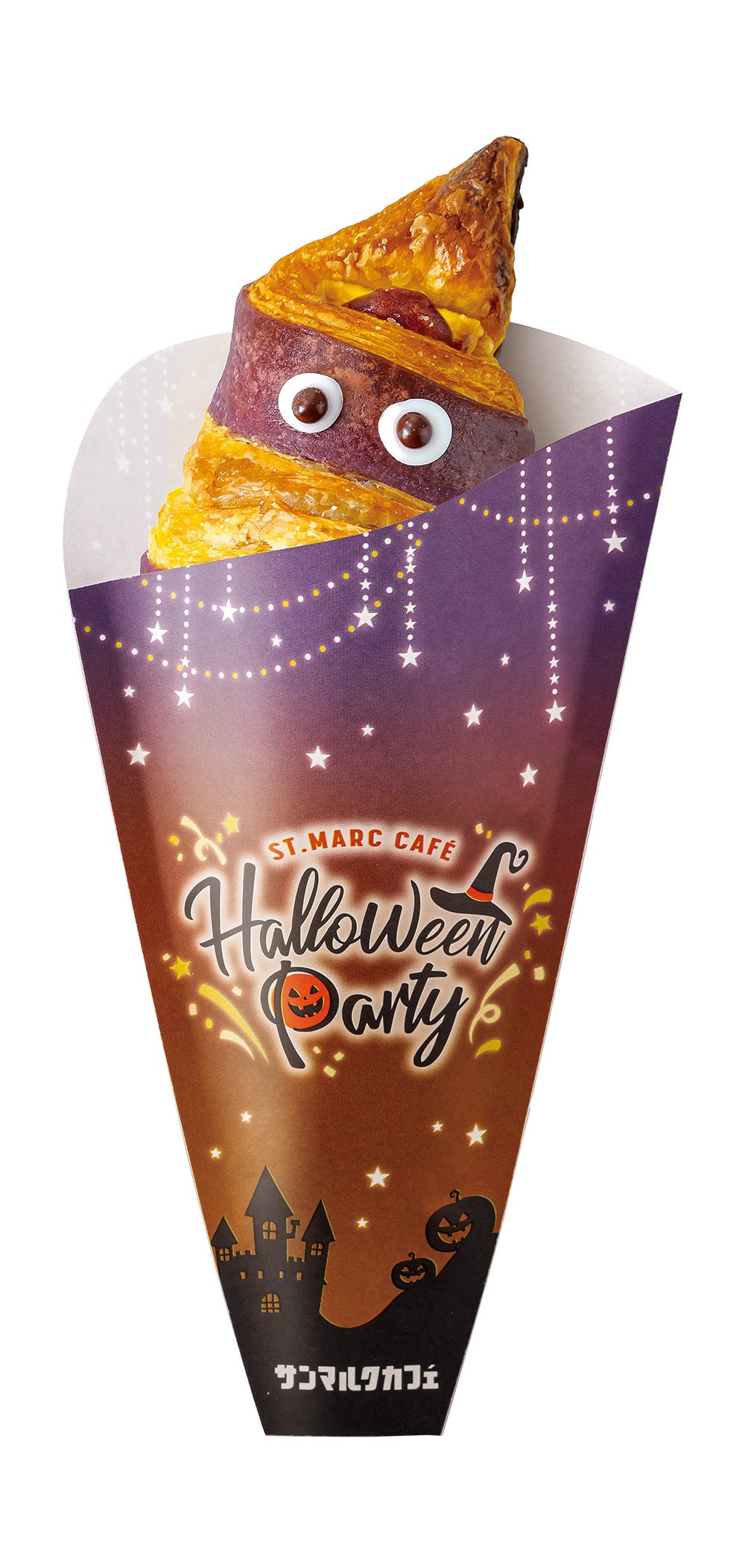 安納いもの焼きいもパウダーを使ったサンマルクカフェ史上初となるバイカラーのクロワッサン生地と安納いもを練り込んだチョコレート、そしてその上に絞られる紅いも餡から構成される、可愛らしいおばけのような『プレミアムチョコクロ いたずらおばけのWスイートポテト』が登場します。