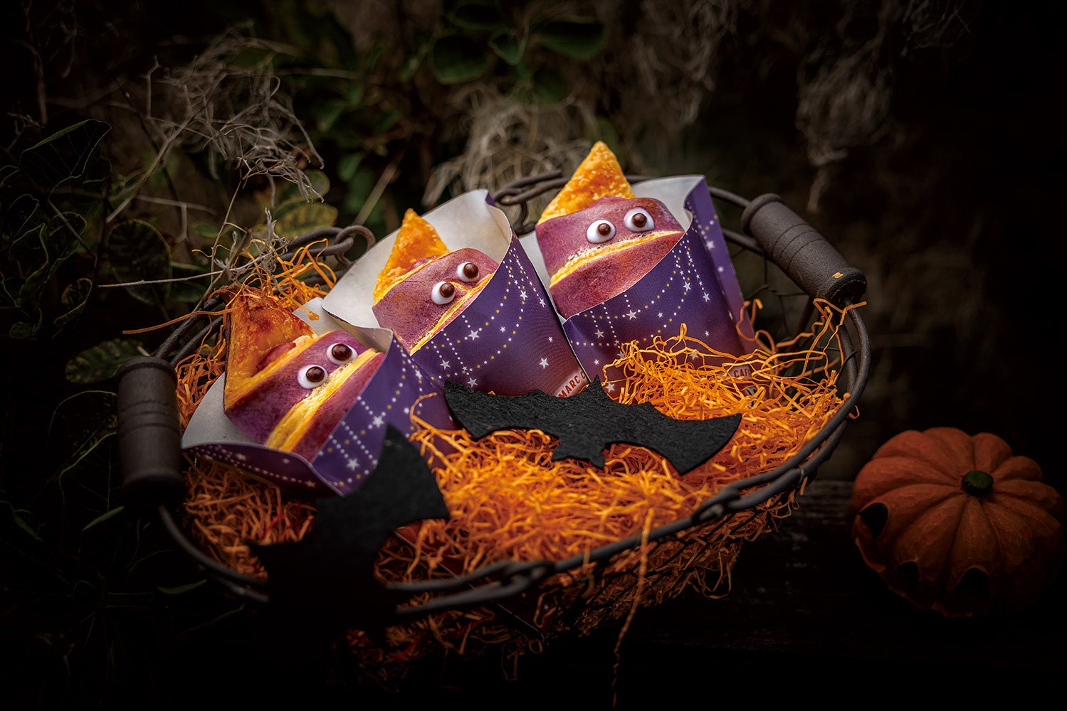焼き上がり時には、お店いっぱいにおいもの優しい香りが広がります。スリーブとBOXは、ハロウィンパーティーをイメージし、煌びやかさと可愛らしさを掛け合わせたデザインで、お土産にもおすすめです。